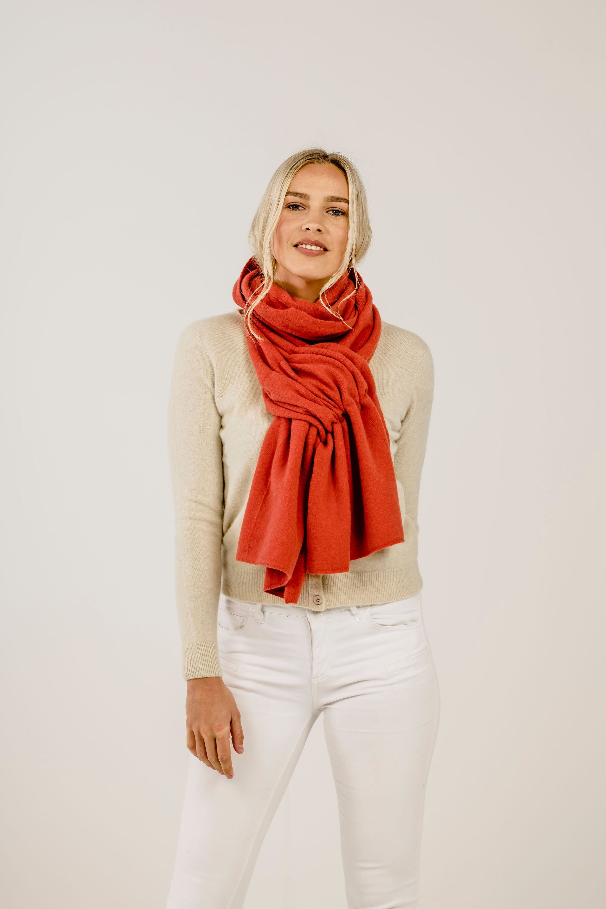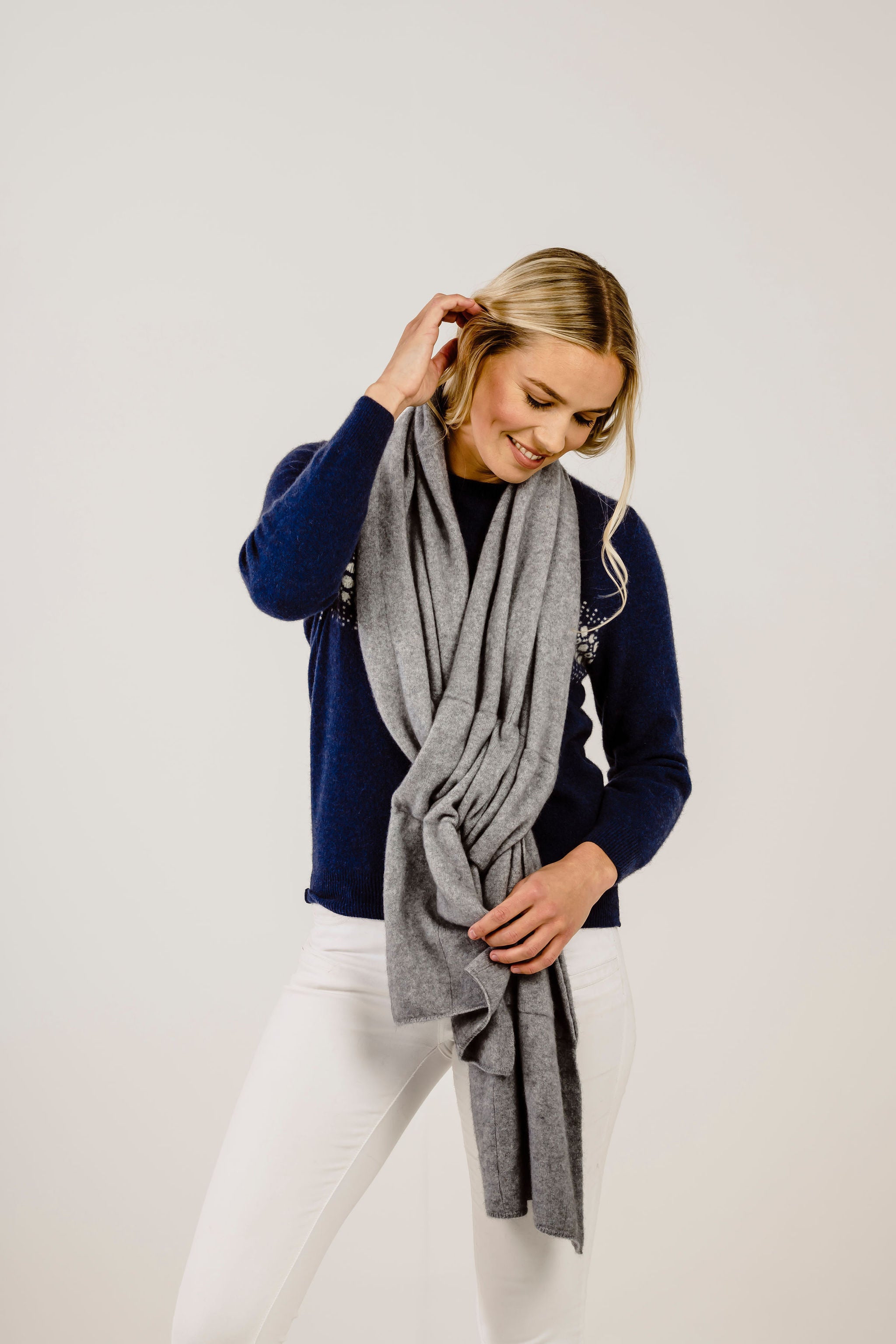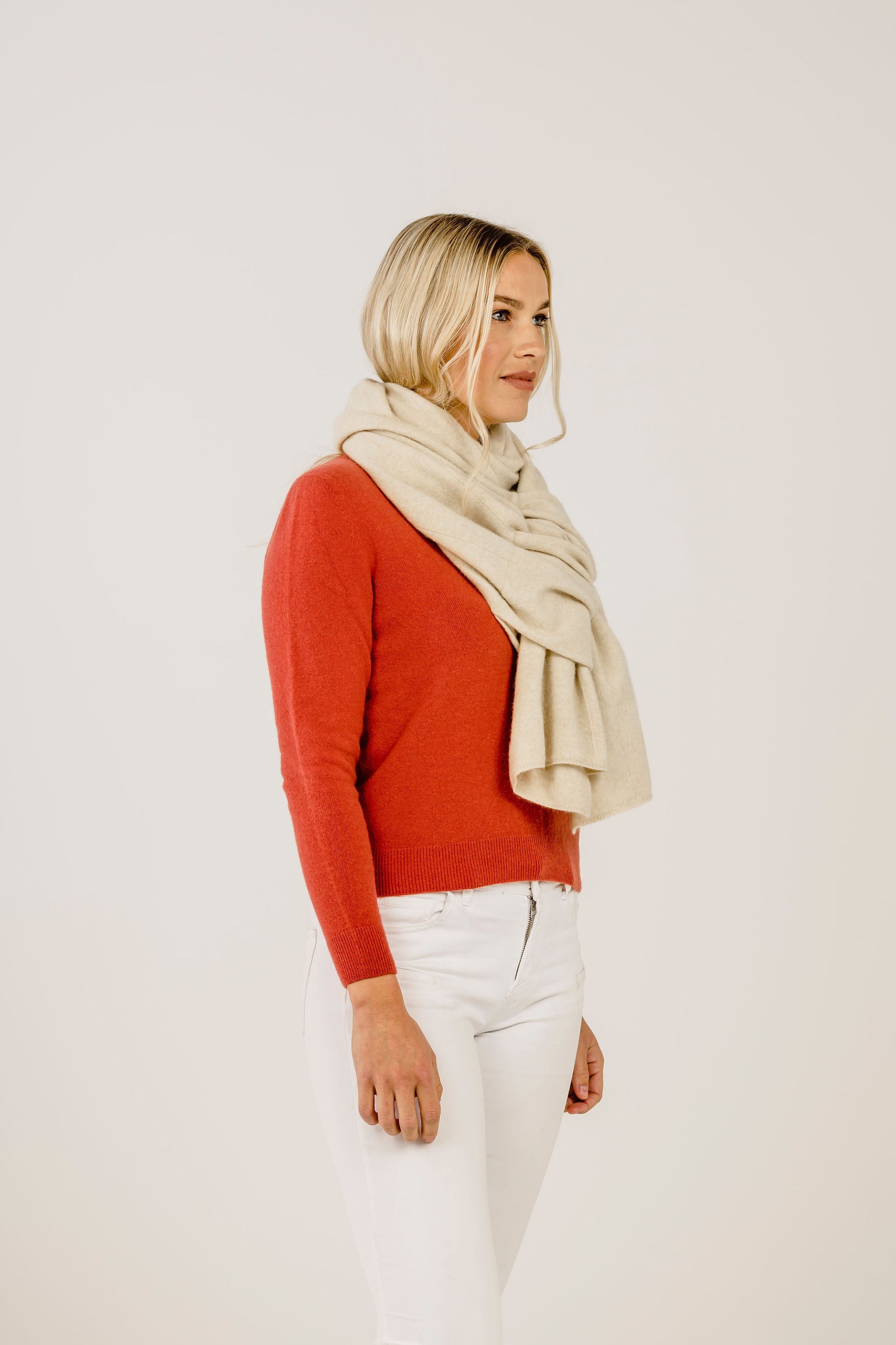 使い方自由自在、ベストセラーアイテムの1つです。両端に通し穴があるので、片方の端を通したりと自分に合った巻き方を工夫することができ、幾通りものコーディネート方法があります。上質なカシミヤとメリノウール、ポッサムダウンを使用したMahana(マハナ)ブレンドでつくられており、柔らかく、丈夫で長持ちします。