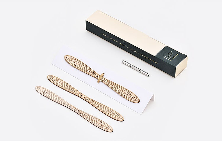 無垢材で作られた、厚み約1.8mmのとんぼの羽のアロマプレート。本体カラーによって、付属する羽の木材も異なります。