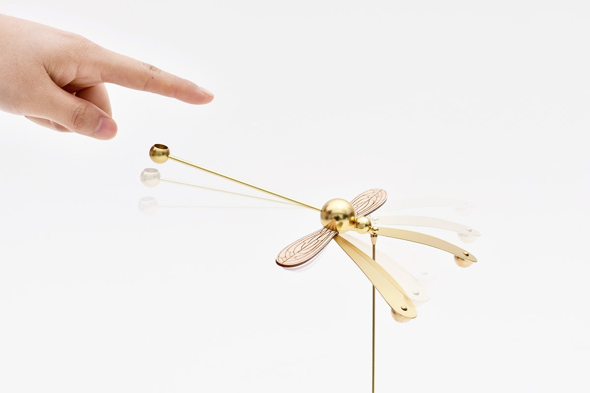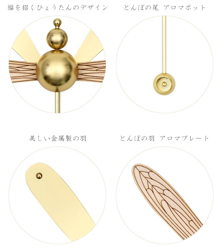 金属と天然木の異素材ミックスが美しい「香り蜻蛉」。ディティールにまで、デザイナーのこだわりがぎゅっと詰まっています。とんぼのボディは、縁起の良いひょうたんをイメージして設計。贈り物にも最適ですよ!