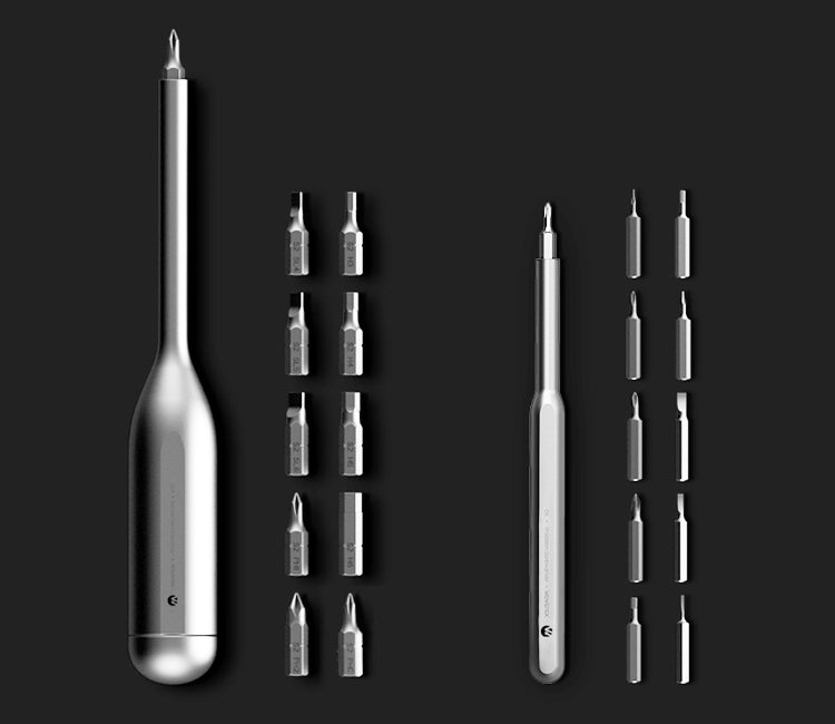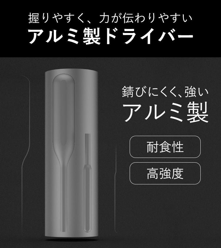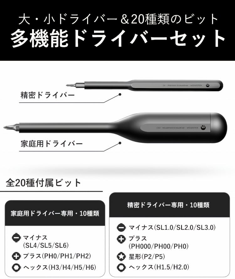 ①大小2種類のドライバー、合計20種類のビットが付属。DIYから精密機械の修理まで幅広く対応!