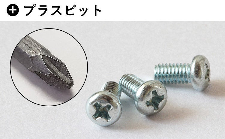 プラスビット。プラスネジ、プラスマイナスネジに使用します。プラスネジには種類が多くありますが、ぴったりと合っていないビットで締めると、ネジ穴が潰れてしまうことが有りますので、ご注意ください。本製品のプラスビットは、ノーマルタイプのプラスネジ専用です。