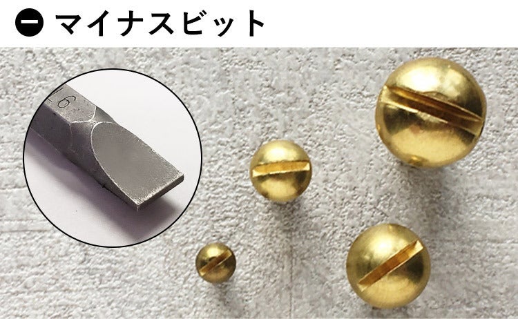 マイナスビット。マイナスネジ、プラスマイナスネジに使用します。埃や汚れが溜まりにくい溝の形状から、水回りなどによく用いられています。