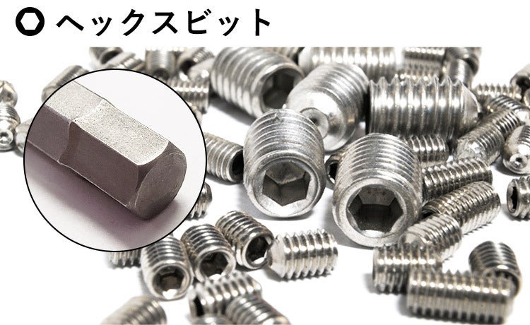 ヘックスビット。機械類によく用いられる、ネジの頭が六角に抜かれているネジ(セットネジ)に使用します。六角レンチをよく使用される方に便利なビットです。
