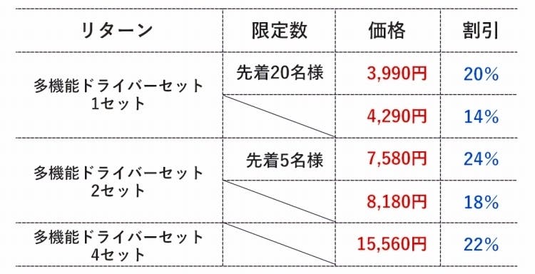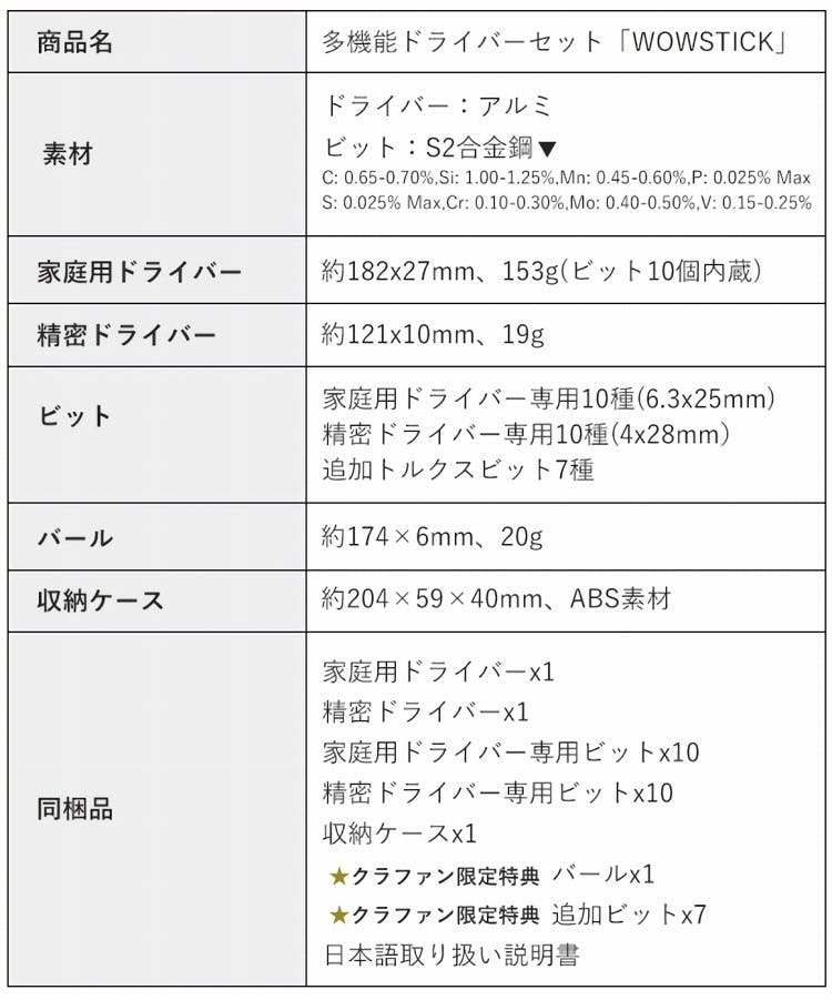 A:家庭用ドライバーと専用ビット10種類、精密ドライバーと専用ビット10種類、専用収納ケース、取扱説明書、【クラファン限定】バール、【クラファン限定】追加ビット7種類のフルセットです。