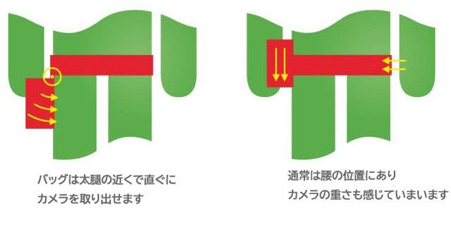 カムスリンガーアウトドアのキャリーポジションは、太ももの位置で低くなっています。 したがって、非常に簡単にアクセスできます。 蝶番のように機能するので、あなたのカメラの重量は腰ではなく大腿にかかり、とても快適です。