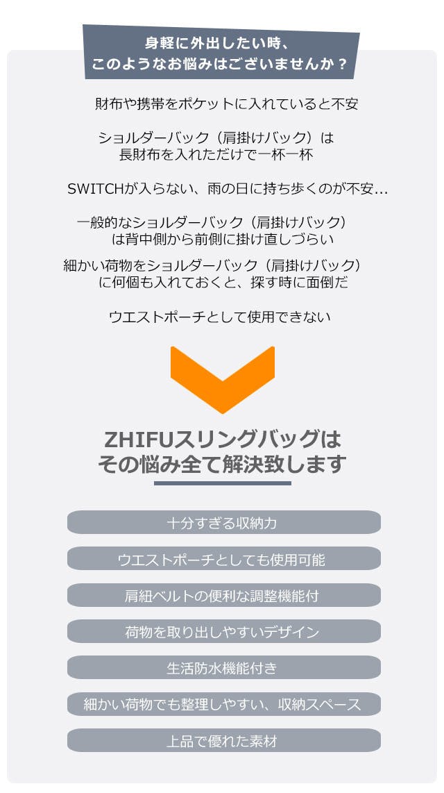 ※ページ上に掲載されている『ZHIFUスリングバッグ』以外のアイテムは付属しません。