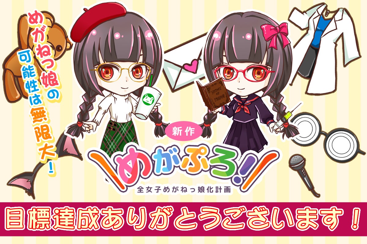 本日10月3日(土)めがねっ娘化着せ替えゲーム『めがぷろ!全女子めがねっ娘化計画』支援計画の目標金額達成しました!ご支援ありがとうございます!まさかこんなに早く達成できるとは思わず、ちょっと驚いております。これもひとえに皆さまのめがねっ娘愛のおかげだと思います!これからもめがねっ娘に愛を注いで頂ければ私たちも嬉しく思います。ちょっと早く達成しすぎて期間もあるので、新たなリターンなど考えたいと思います。進捗あれば改めてご報告いたします。まだまだ支援を受け付けております!今後もよろしくお願いします!