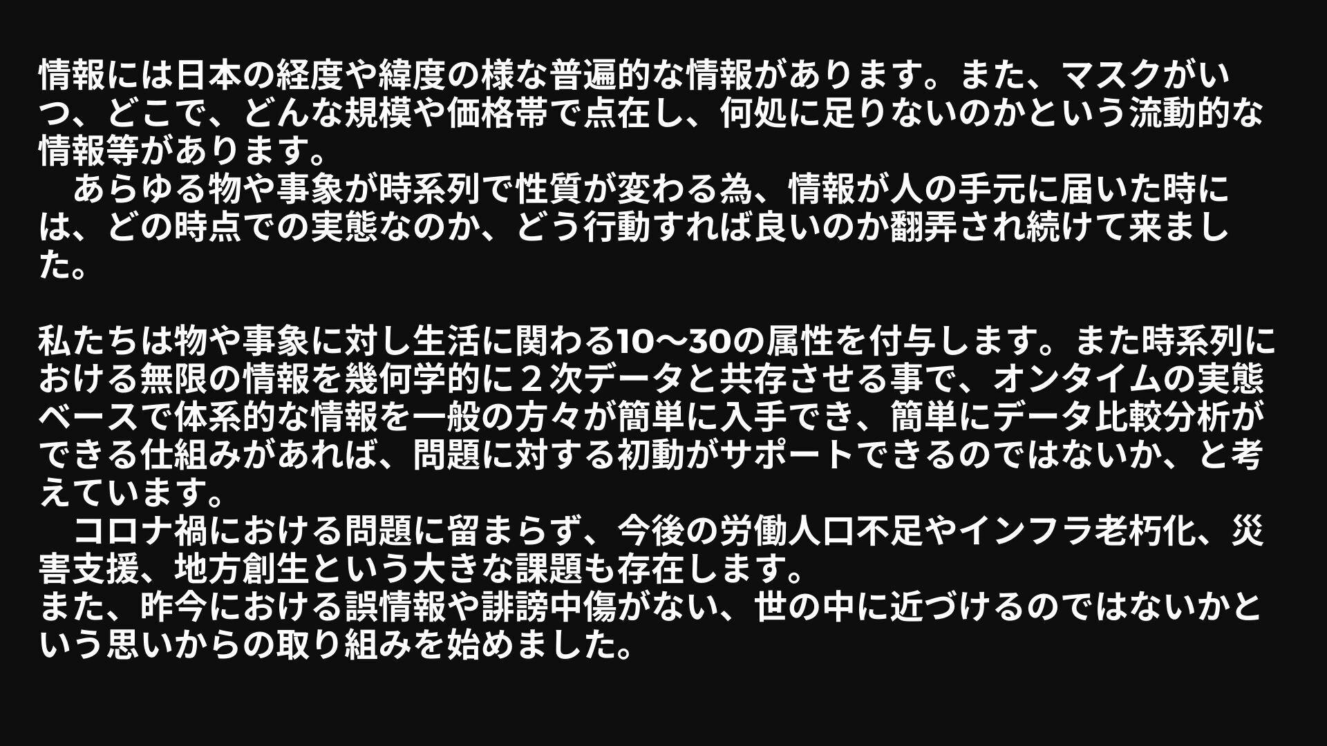 この度のコロナ禍だけでなく今後の日本の課題を解決する為に国民一人一人が情報武装し率先して自治体や次世代に対しよい遺産を築いていけるサポートの為の開発を目指します。