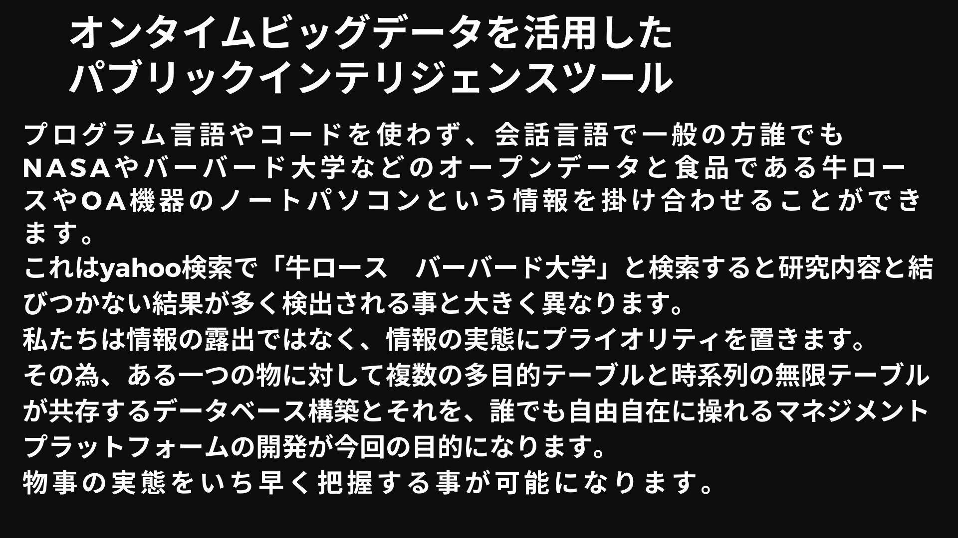 義務教育修了後におきましても様々な事情から進学を断念する方々もおられます。また一般生活においても各分野での膨大な情報をグローバル視点で整理する為には時間やお金がかかったりプログラミング言語やiT技術を要したりとハードルが低くはありません。今回の開発ではそれらを無償でサポートできればという思いで、今回の露出を決めました。