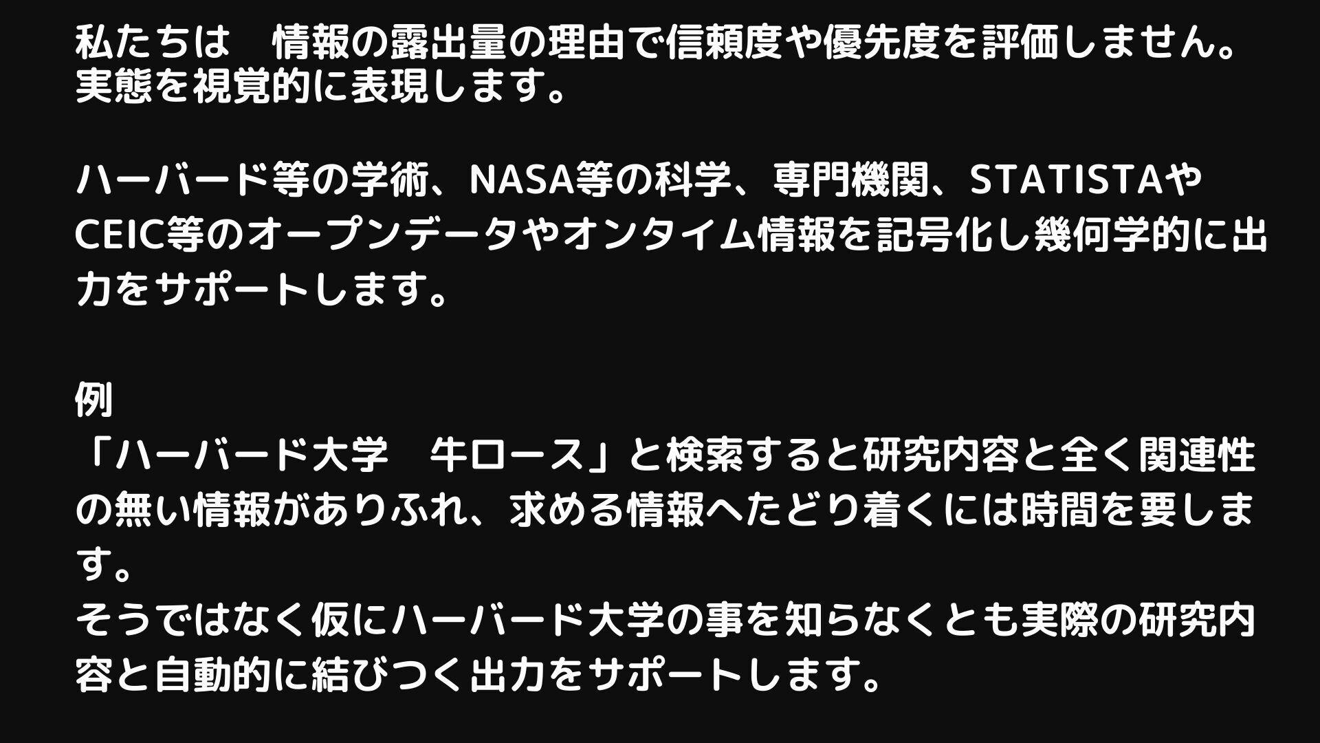 日本の最新トピックと世界に存在する実証に基づいた同等のトピックが結びつき体系的に可視化できます。単純に思えますが、1日に一個やニ個のトピックではなく何十何百になると時間もありませんし、また検索によって辿り着くには多くの知識を必要とし過ぎています。