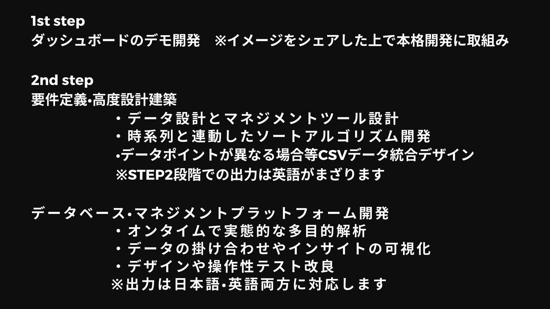 2つ目は上流工程や守秘義務などの課題をクリアにする為、STEP1とSTEP2において開発者をなるべく統一する必要がありました。その為デモだけを開発しようと思うと、それはすでにデモではなく、開発になってしまう事が理由にございます。何卒ご理解ご協力の程よろしくお願いいたします。