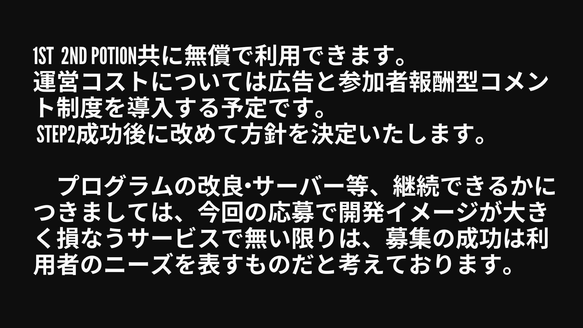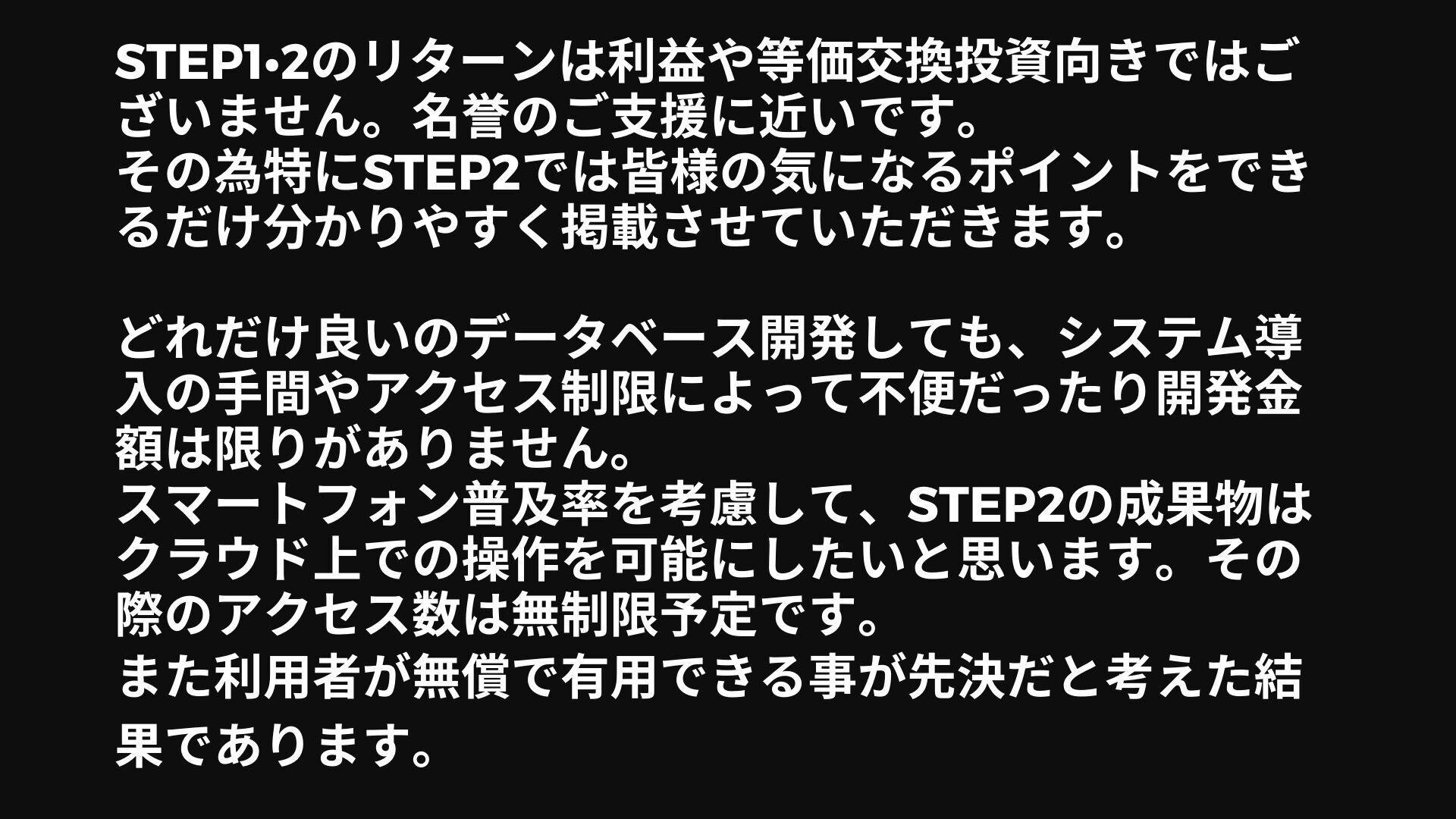 しかしながらSTEP1でご支援頂きそれを我々が目的に沿った設計を行い、デモという形で表現できればSTEP2での開発や運営はエンドユーザーのテストなどによって幅広いデザインと操作性をカバー出来る事を約束いたします。