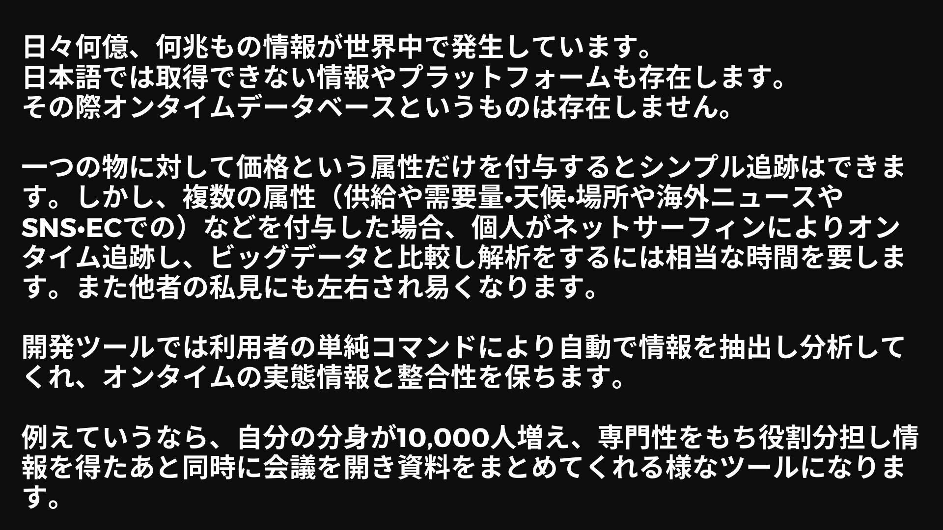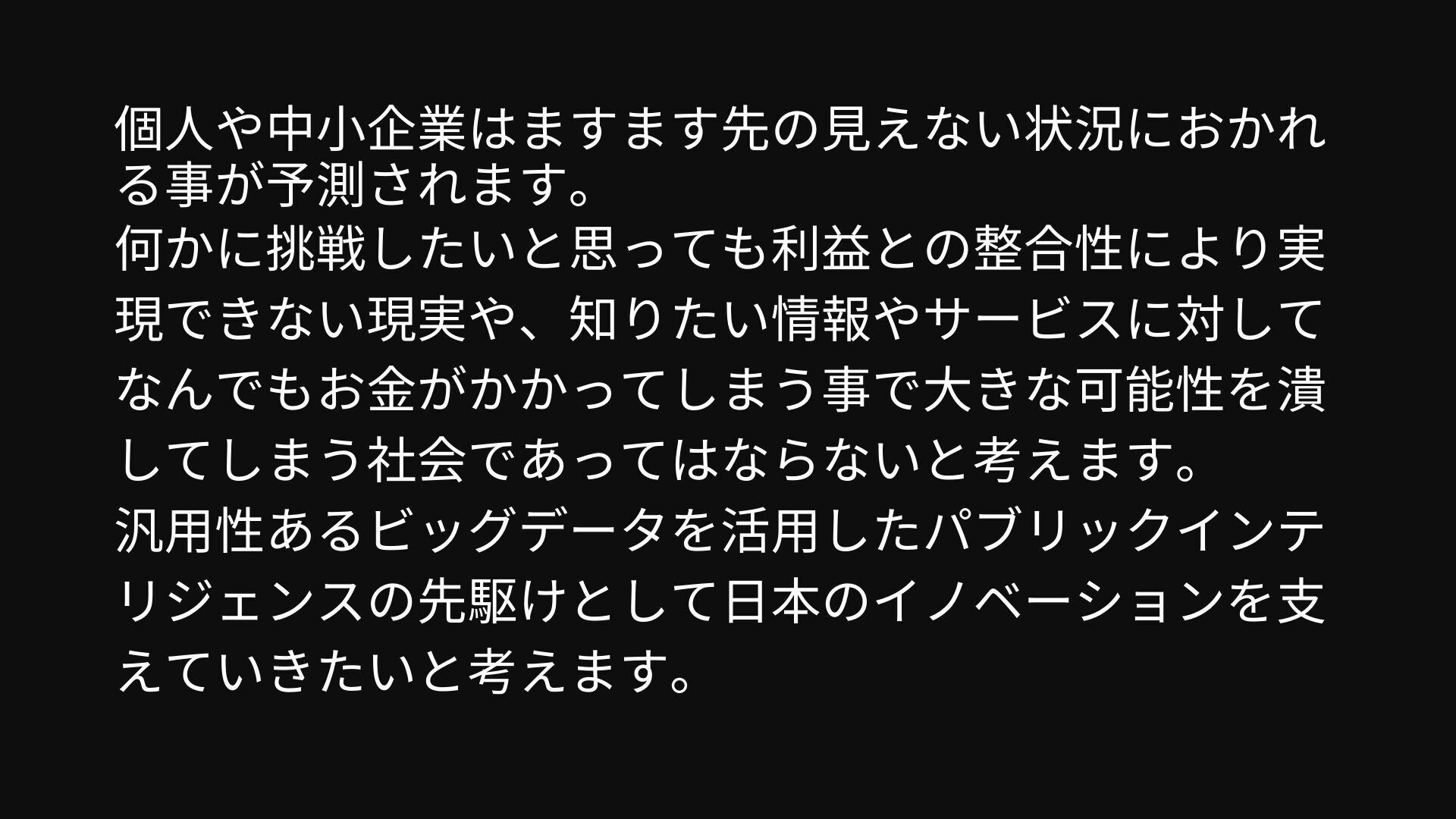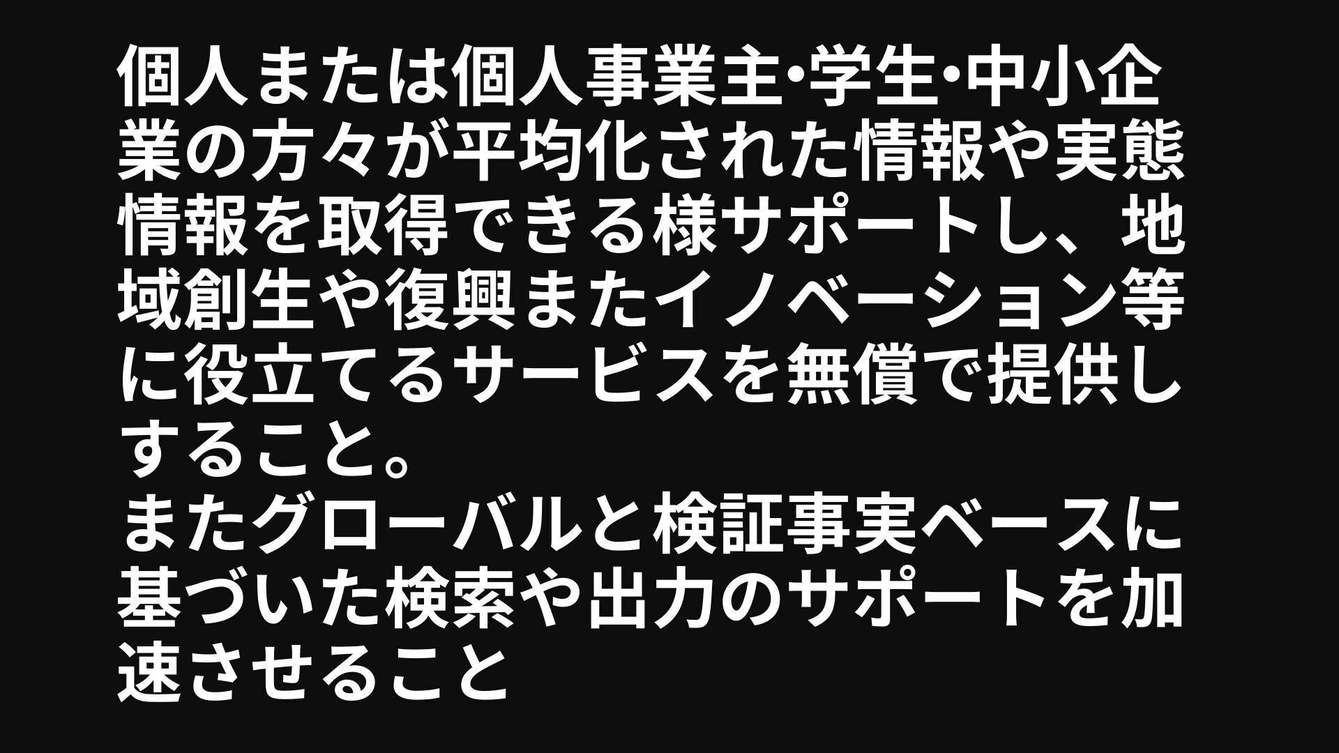 義務教育修了後におきましても様々な事情から進学を断念する方々もおられます。また一般生活においても各分野での膨大な情報をグローバル視点で整理する為には時間やお金がかかったりプログラミング言語やiT技術を要したりとハードルが低くはありません。今回の開発ではそれらを無償でサポートできればという思いで、今回の露出を決めました。