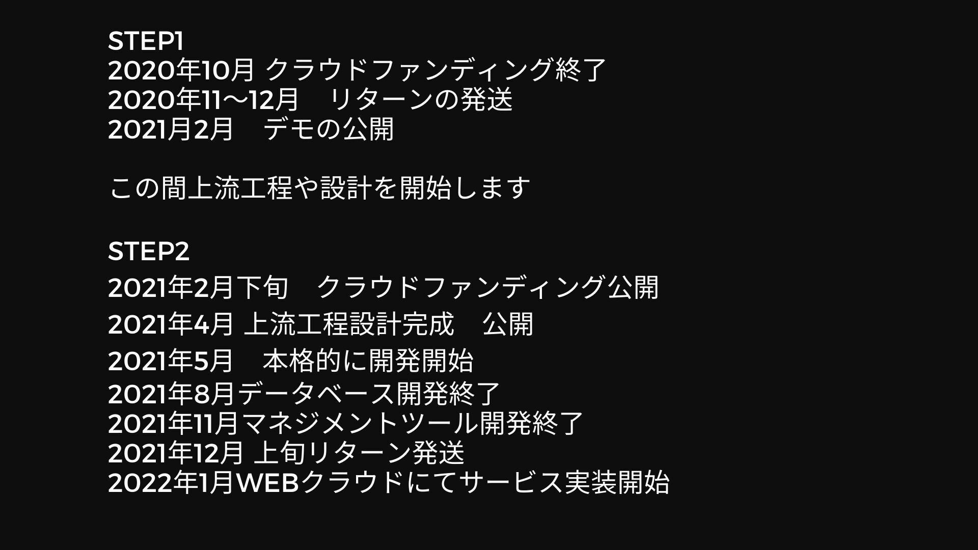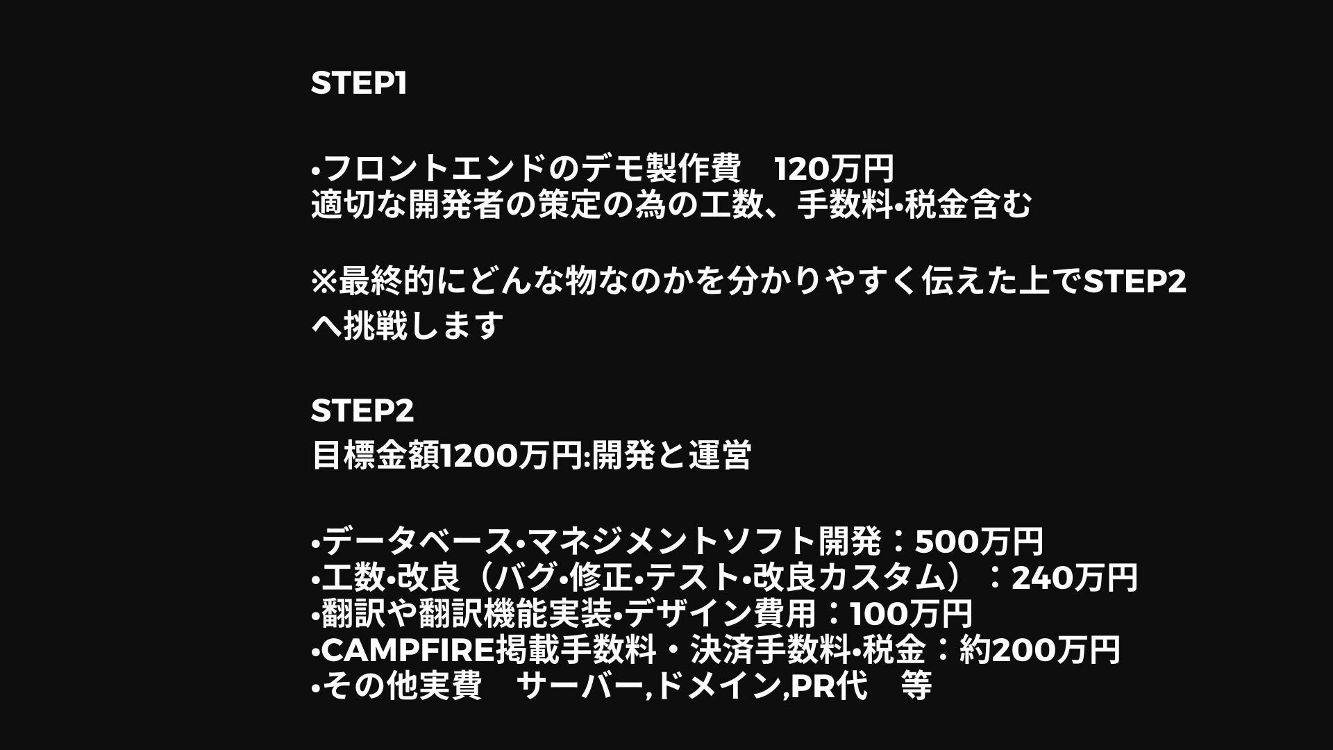しかしながらSTEP1でご支援頂きそれを我々が目的に沿った設計を行い、デモという形で表現できればSTEP2での開発や運営はエンドユーザーのテストなどによって幅広いデザインと操作性をカバー出来る事を約束いたします。