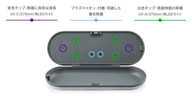 除菌コンパクトは、波長の異なる2種類のUV-LEDライトとプラズマイオンにより除菌を行います。