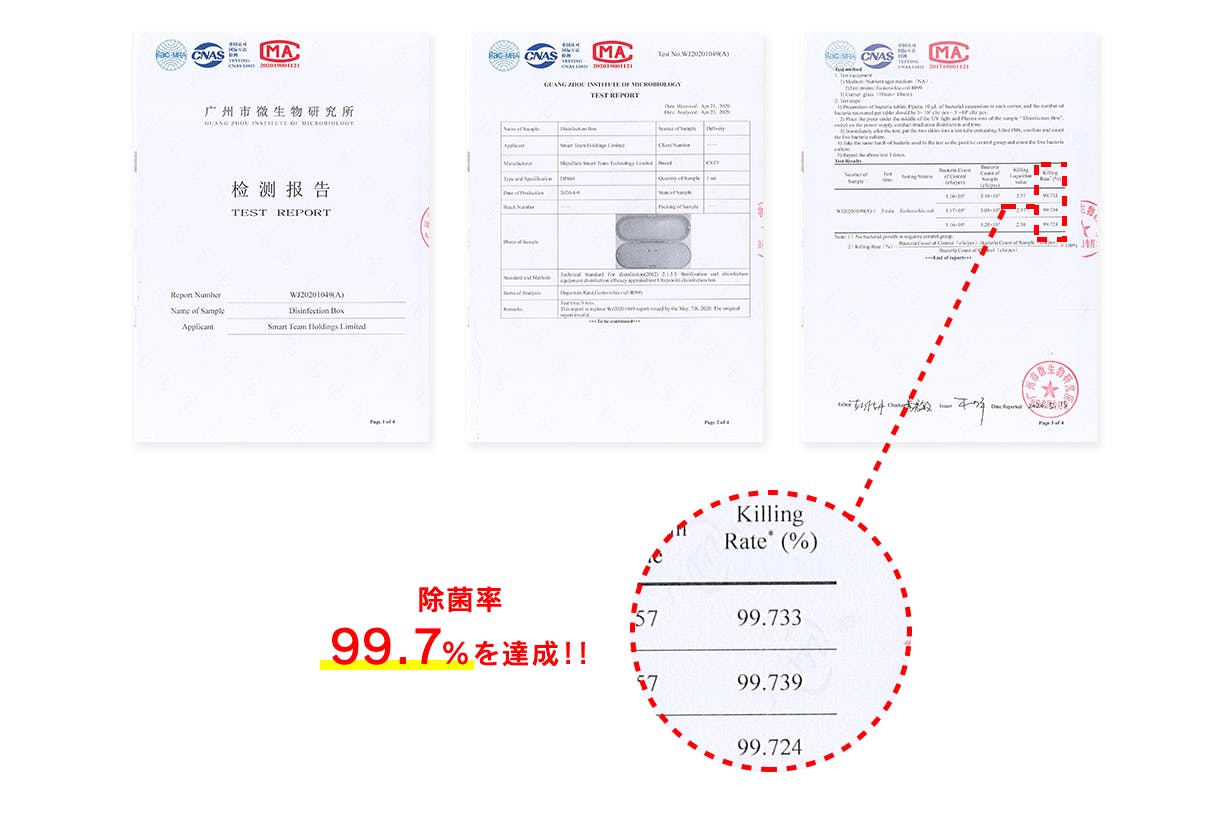 除菌効果が中国国家認定検査機関である広州市微生物研究所(GUANGZHOU INSTITUTE OF MICROBIOLOGY)で確認されています。