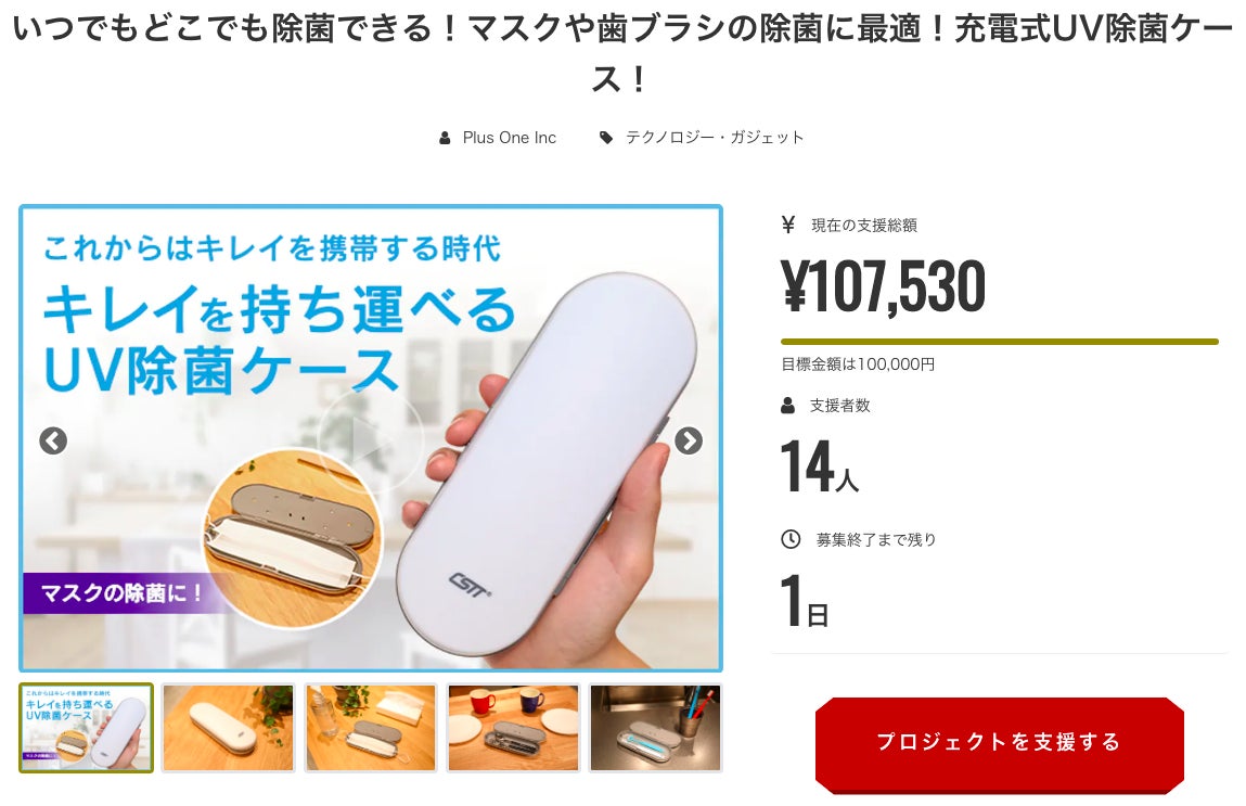 こんばんは!キレイを持ち運べるUV除菌ケース「除菌コンパクト」プロジェクト推進者です!本日、目標金額を達成し、プロジェクトがサクセスしました!ご支援を頂いた皆様、ありがとうございます。プロジェクトは、明日で終了となります。クラウドファンディング価格でお買い求め頂けるのも明日までとなります。是非、この機会にお買い求めください^^商品は既に納入されていますので、プロジェクトが完了次第、すぐに発送できるよう進めて参ります。P.S.)CAMPFIREのCM公開を記念して、CM公開記念クーポンが只今発行されています!是非、ご利用ください^^https://camp-fire.jp/cm