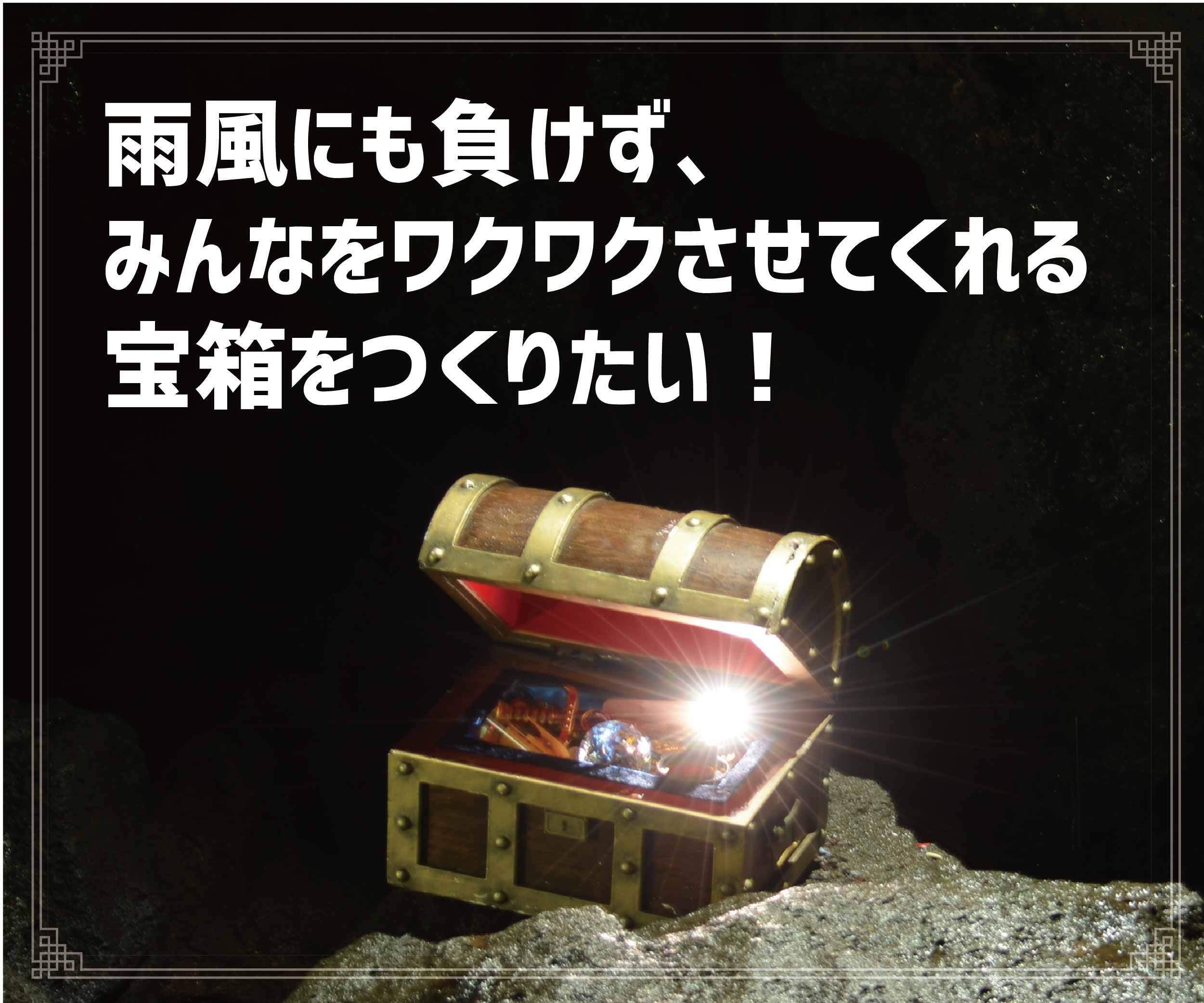 私達が新たに開発する素晴らしい宝箱を世界中にたっくさん隠していきますので、いつか皆さんが世界の片隅で宝箱を見つけた時、「これは自分が作った宝箱だ」と自慢してください。