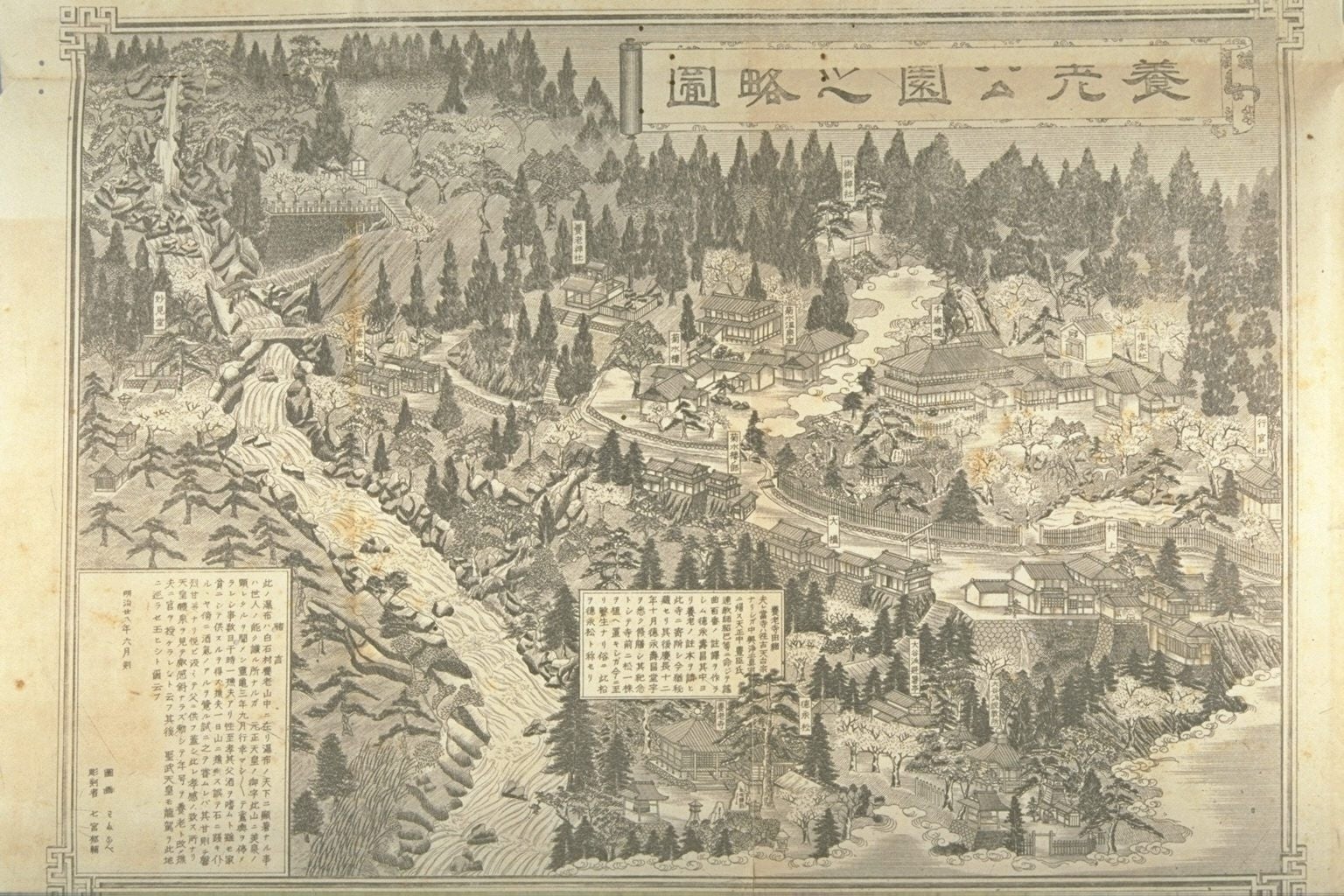 「千歳楼」は岐阜県の西南部、濃尾平野の西端に位置する養老町養老公園の中にあります。養老公園は、1880年開園という都市公園では屈指の歴史ある公園で、養老の滝を中心に飛騨美濃さくら33選に選ばれた桜、環境省のレッドリストに載る淡水魚のハリヨ、紅葉やカエデの紅葉など四季折々のさまざまな資源に恵まれています。 この養老公園のある養老山地は水が豊かで、「滝の水がお酒になった」という親孝行の孝子伝説の滝として知られている養老の滝や環境省の名水百選に選ばれている菊水泉が有名です。