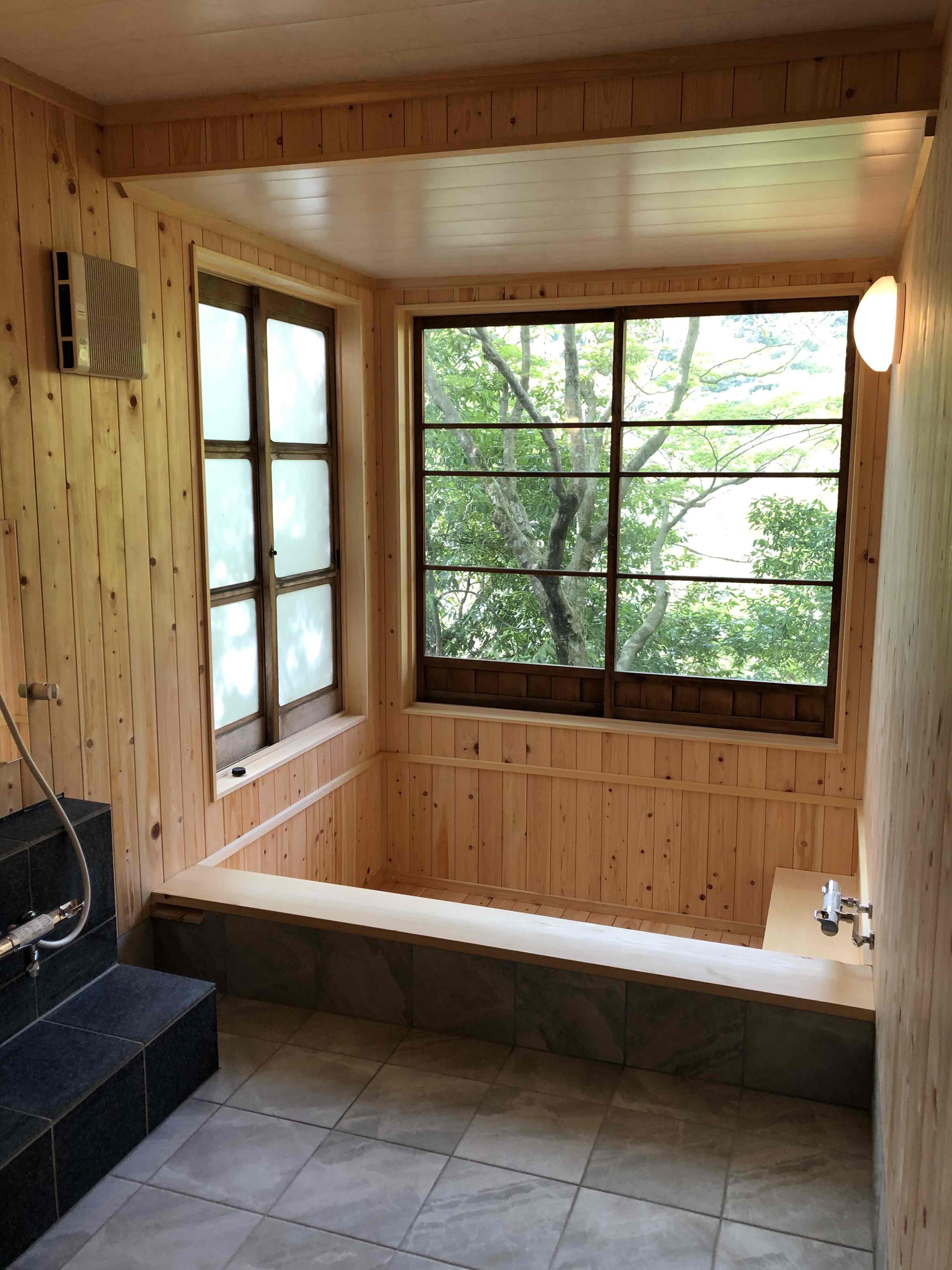 新しいお風呂をご紹介させて頂きます。同じタイプのお風呂を2つ、男湯と女湯別々にご用意させて頂きました。浴槽とお風呂場の壁には檜が使われ、檜の香りがとっても心地よいです。大きな窓からは、今は新緑がとても綺麗に見えます。今週のご宿泊から薬湯風呂を楽しんで頂けます。是非新しい千歳楼にお立ち寄りください。皆様にお会いできるのを楽しみにしております。