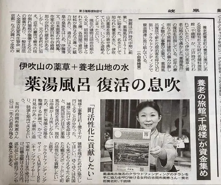 大晦日に岐阜新聞さんで千歳楼の”薬湯風呂復活プロジェクト”をご紹介頂きました!