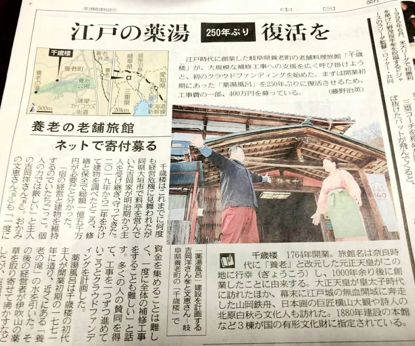 先日の岐阜新聞に続き、昨日は中日新聞の夕刊で千歳楼の”薬湯風呂復活プロジェクト”をご紹介頂きました。