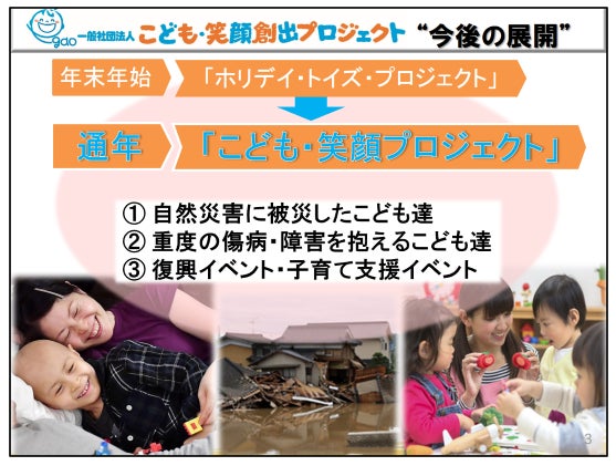 東日本大震災で発生した津波で家族を失い、不自由な生活を強いられているこども達を、年末年始のひと時だけでも、おもちゃで遊んで、笑顔になって欲しいとの思いから、被災地の市町村のご協力を頂き、被災遺児・孤児を中心に、おもちゃと交換できる「こども商品券」をクリスマスプレゼントに贈る活動を継続して参りました。