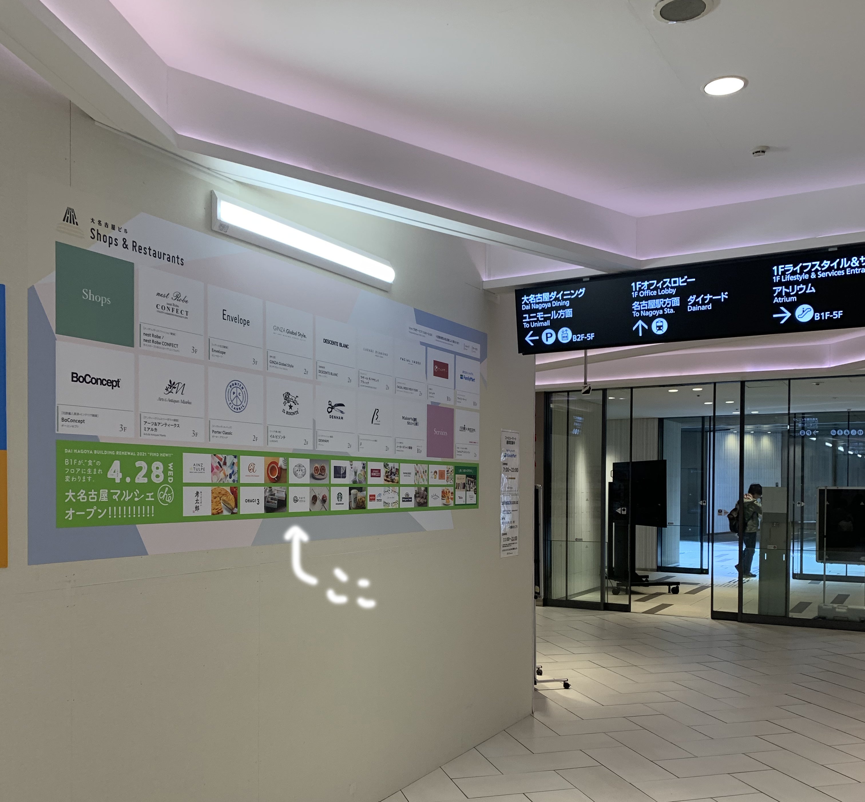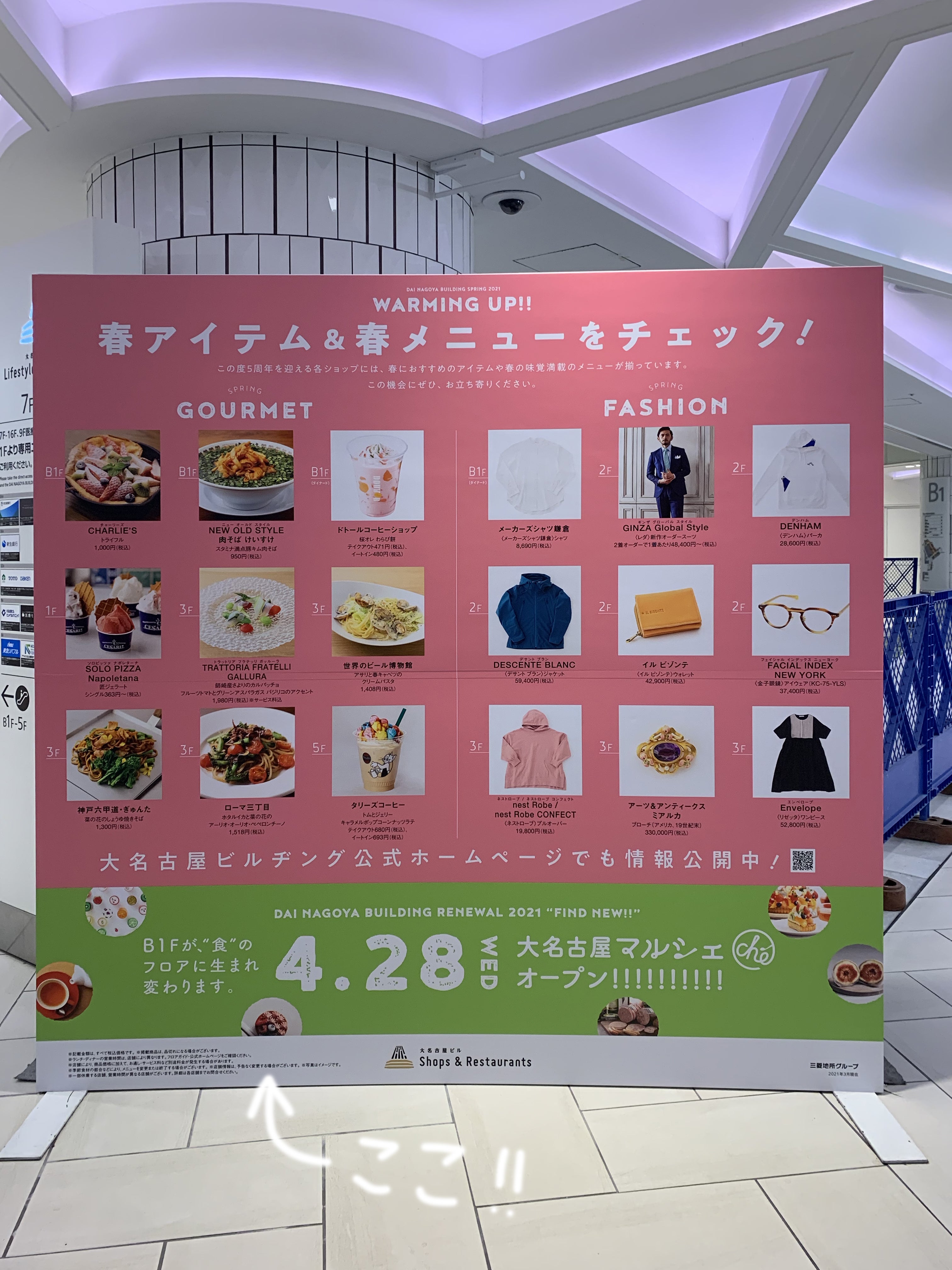 早速ご報告します。現地にいったら大名古屋ビルヂングのリニューアルの告知が開始されてました。キュームタルトが名古屋駅で告知されている!