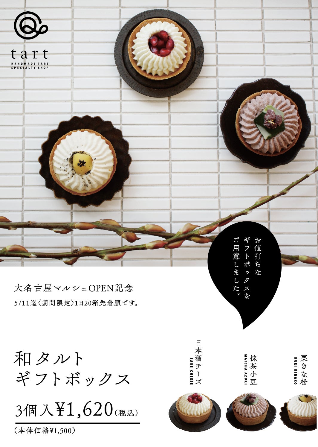 連日たくさんのご来店いただいております。誠に有難うございます。本日は大名古屋マルシェオープン記念期間限定の和タルトのご紹介です。ぜひ現地でご購入くださいませ。(名古屋以外の方すいません・・)◎栗きな粉抹茶ガナッシュと栗を入れたきな粉ムースに黒蜜入りのクリームを絞りました黒ゴマと栗の甘露煮をのせたタルトです◎抹茶小豆小豆と抹茶の生地を焼き上げたクレームダマンドにこし餡クリームを絞り、抹茶チョコと小豆をのせたタルトです◎日本酒チーズ酒粕入りのアーモンドクリームを焼き上げ、日本酒を混ぜたチーズクリームの絞りとザクロを飾った大人のタルトです※お酒を使ってます「和タルト」はギフトボックス1日限定20個、個包装は各15個限定。5/11(火)までの販売となりますクラウドファンディング、いよいよあと10日です。現在1,222,906円 支援者181人目標には届かないかもしれませんが最後まで諦めたくないので応援宜しくおねがいします。