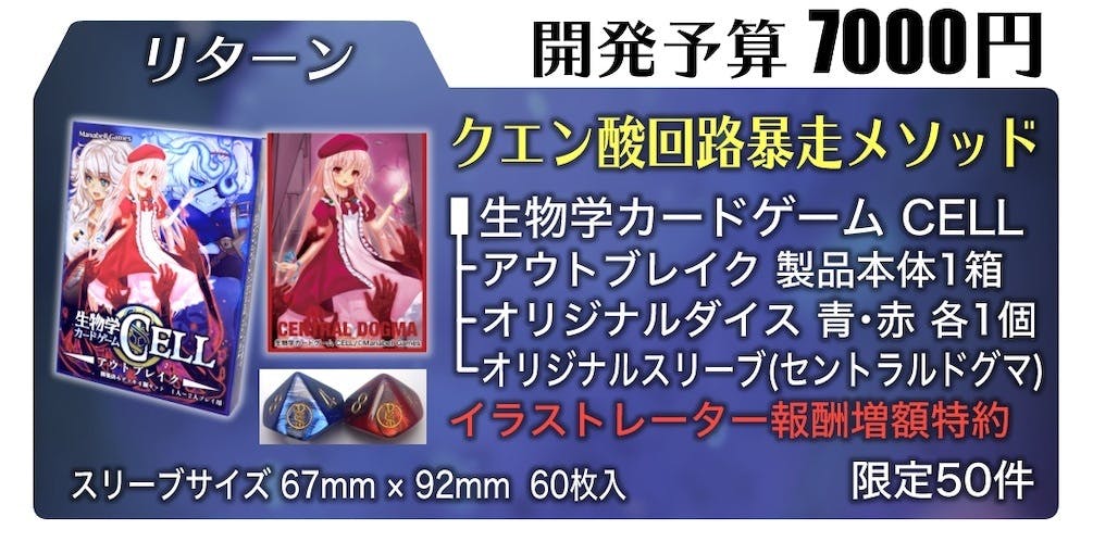 2020/11/14 20:38本日、11月14日にCELLはゲームマーケット2020秋にて発売日を迎えることができました。コロナウイルス感染症が広まり、来場者数が普段よりだいぶ少ないという厳しい状況下ではありましたが、そんな中でも初日に80箱を売り上げることができ、順調なスタートを切ることができました。ここまで来れたのも、多くの方々のご支援、ご声援の賜物であると、心から思います。皆様、本当にありがとうございます! 弊社は明日の二日目も引き続きゲームマーケットに出展させていただきます。会場へお越しの際には、ぜひ弊社のブースへお立ち寄りくださいませ。 また、本クラウドファンディングは、ストレッチゴールに挑戦中です。明日(15日)の24時のクラウドファンディング終了まで、残りわずかとなっておりますが、この記事を書いている現在で、残り68,600円のご支援をいただければ、ストレッチゴールに到達できます。また、「クエン酸回路暴走メソッド」のリターンは、残り1名様にご支援をいただけますと、イラストレーター様の報酬額が500円アップとなります。ストレッチゴールの方と併せて達成できれば、報酬額は合計1500円アップとなりますので、ぜひともご支援の方をよろしくお願い申し上げます。 もっと見る