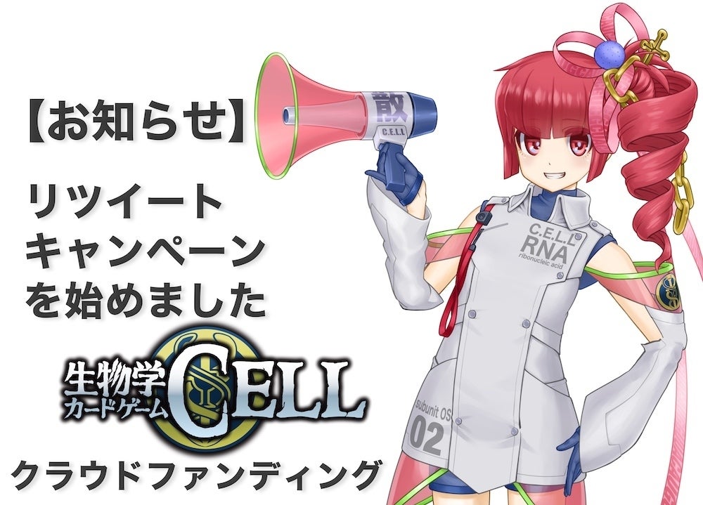 クラウドファンディングの日数も残りわずかとなってきました。そこで、Twitterにてプレゼント付きのリツイートキャンペーンを実施させていただくことにしました。下記のツイートをリツイートしていただいた方々の中から抽選で3名様に、生物学カードゲーム CELL アウトブレイク 1箱をプレゼントさせていただきます! もしよければリツイートでの広告&拡散にご協力ください!
