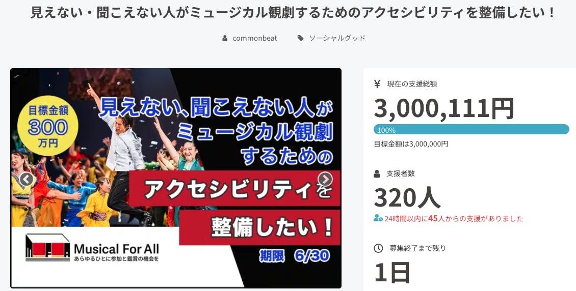 昨日22時25分に目標金額300万円を達成し、クラウドファンディング「見えない・聞こえない人がミュージカル観劇するためのアクセシビリティを整備したい!」が無事に成功しました!