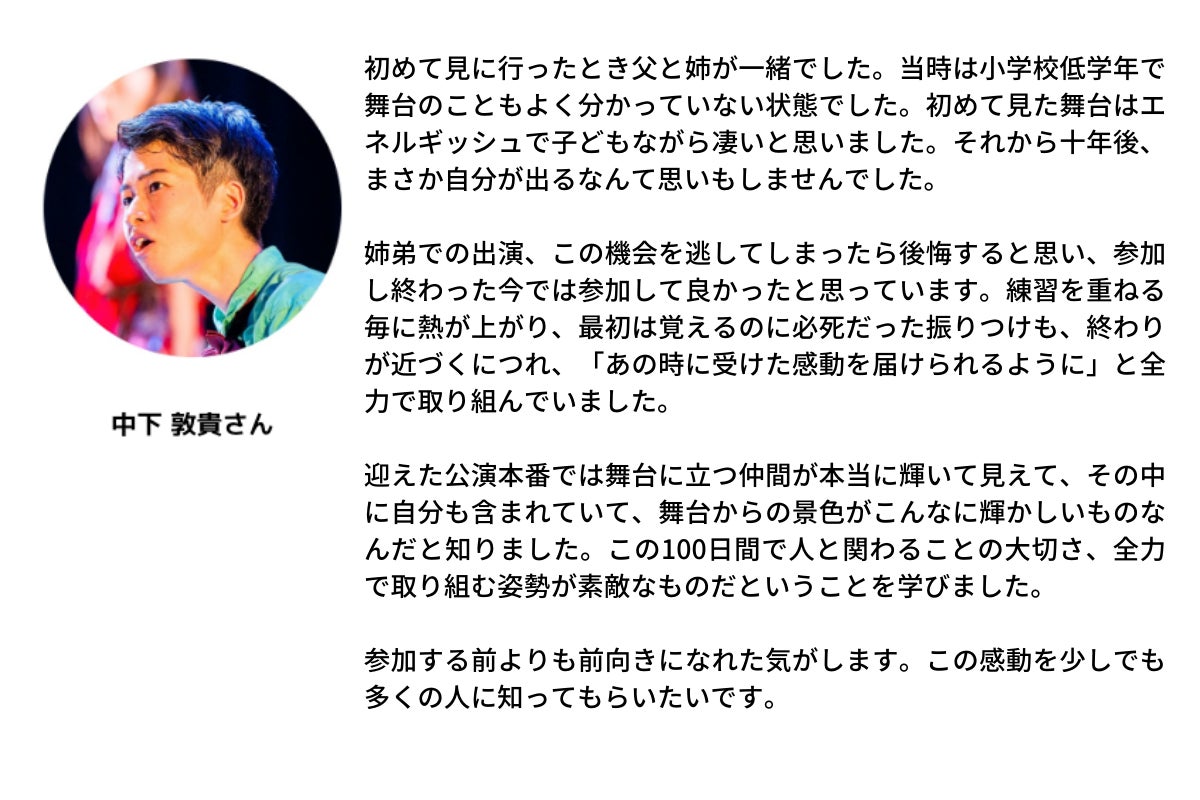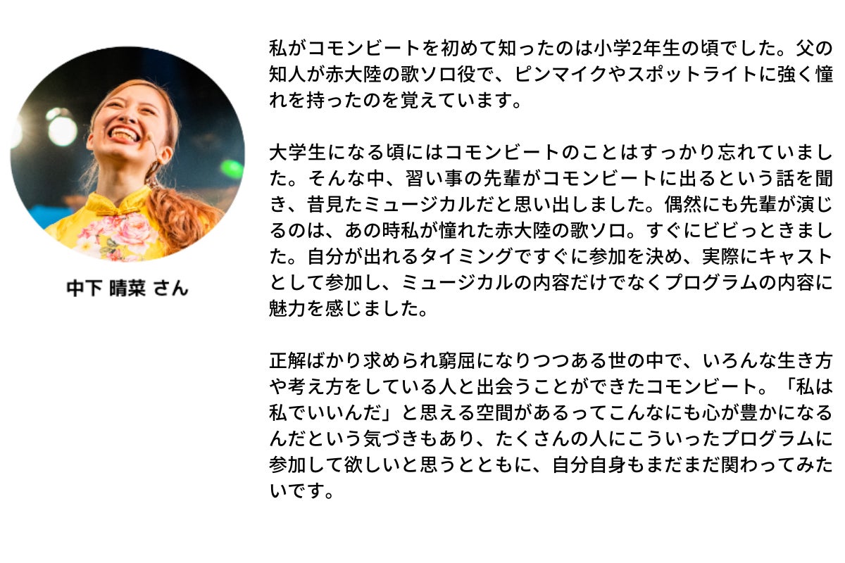 子どもたちがミュージカル「A COMMON BEAT」を鑑賞し、参加するまでには時間がかかります(ミュージカル参加は18歳以上のため)。ですが、これまでにも、子どもの頃に招待でコモンビートのミュージカルを鑑賞したことが記憶に残り、18歳になってからキャスト参加する例も生まれています。鑑賞するだけではなく、舞台に立つことができる市民ミュージカルならではの醍醐味です。