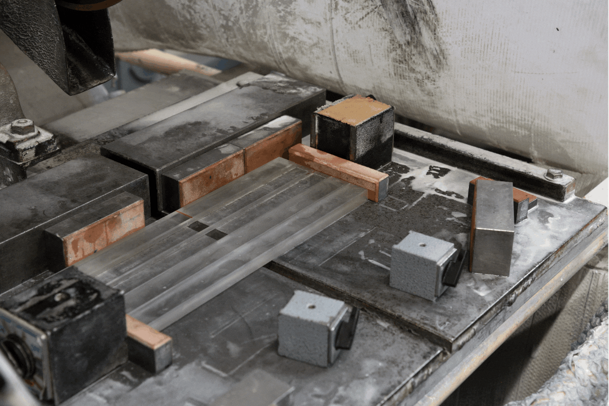【定規 [SHORT]/[LONG]】はどちらも同じ材料から制作します。このガラス角材は長さが約265mmあり、この長さをそのまま活かしたものが[LONG]、半分に切断したものが[SHORT]になります。