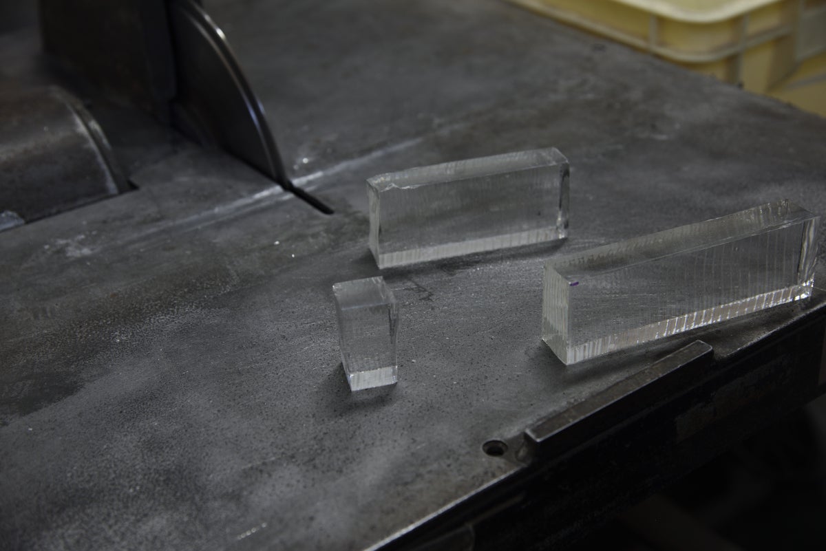 私たちは「火切り」と呼んでいますが、実際に火を使うわけではありません。上の動画のように、ガラスの板材に砥石で部分的に熱を加えることによってガラスを割ります。「火切り」はこれを繰り返し必要な大きさのガラスの塊を取得する、光学レンズ等を製造する際の初期の工程です。
