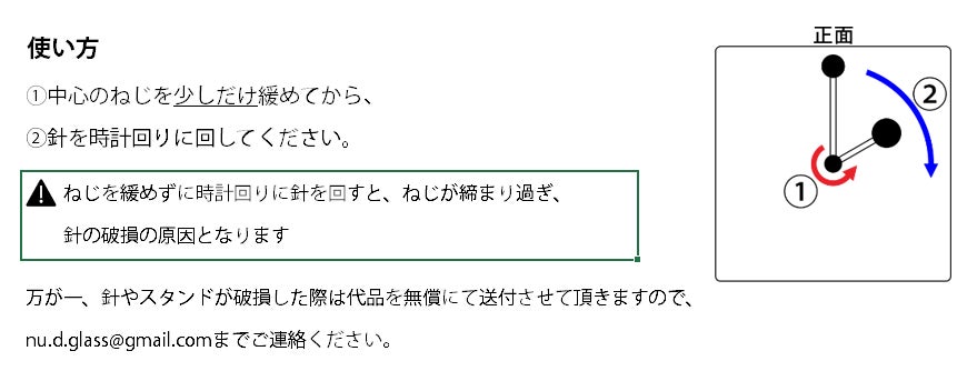 日付を合わせる際は、上記説明書(現品添付)のとおり、必ずねじを緩めてから針を回して頂きますようお願い致します。