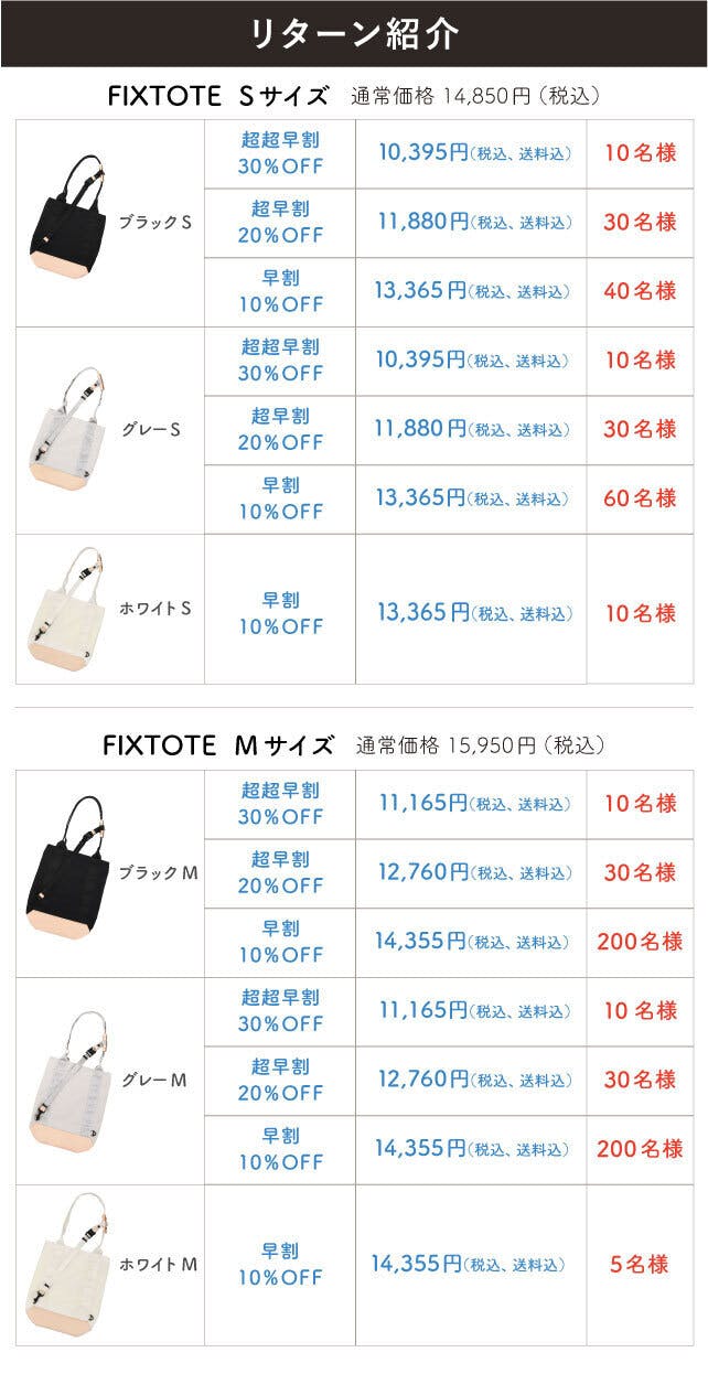2020/11/19 18:00ご支援者の皆様この度は、「FIXTOTE プロジェクト」をご支援いただき、誠にありがとうございます。おかげさまで、支援金額が100万円を突破いたしました!!発送は、活動レポートでもご案内しておりますが、お届け日表記に間違いがあり、12月1日より順次発送予定となっております。ご迷惑をおかけし、大変申し訳ございません。商品はすでに発送できる状態のため、12月1週目から遅くとも10日頃までに出荷できる見込みです。プロジェクト終了後、速やかに出荷できるよう準備をしてまいります。何卒、よろしくお願いいたします。 もっと見る