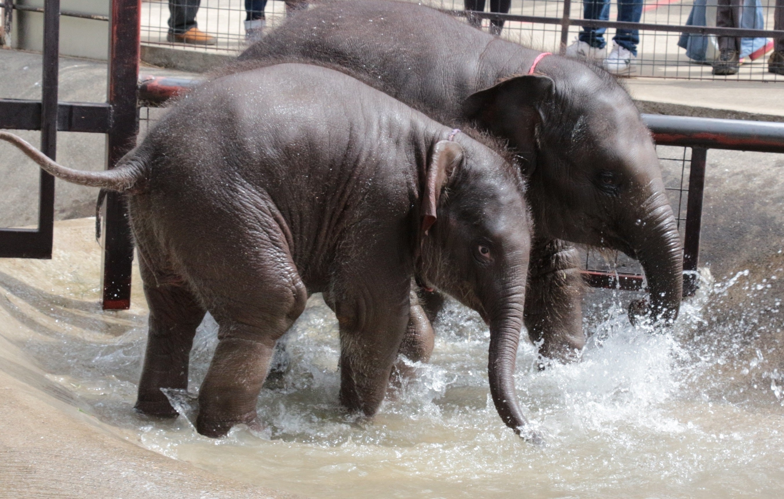 月日が経ち、ぞうさん達が暮らす象舎が老朽化した為、快適な住環境に整えようと4年の歳月をかけて今年ようやく新しい象舎が完成しました。そんな折、1歳と2歳の子ゾウ「ら夢」と「もも夏」が、2頭でキャッキャと水遊びをしている姿に、夢中になっているお客様を見て、もっと楽しい姿を見てもらいたいと“ゾウの水遊び場”をつくることを考えました。ぞうさん達は水が大好きです。大好きな水が噴き出す水遊び場にと考え、「エレファント スプラッシュ」と名付けました。