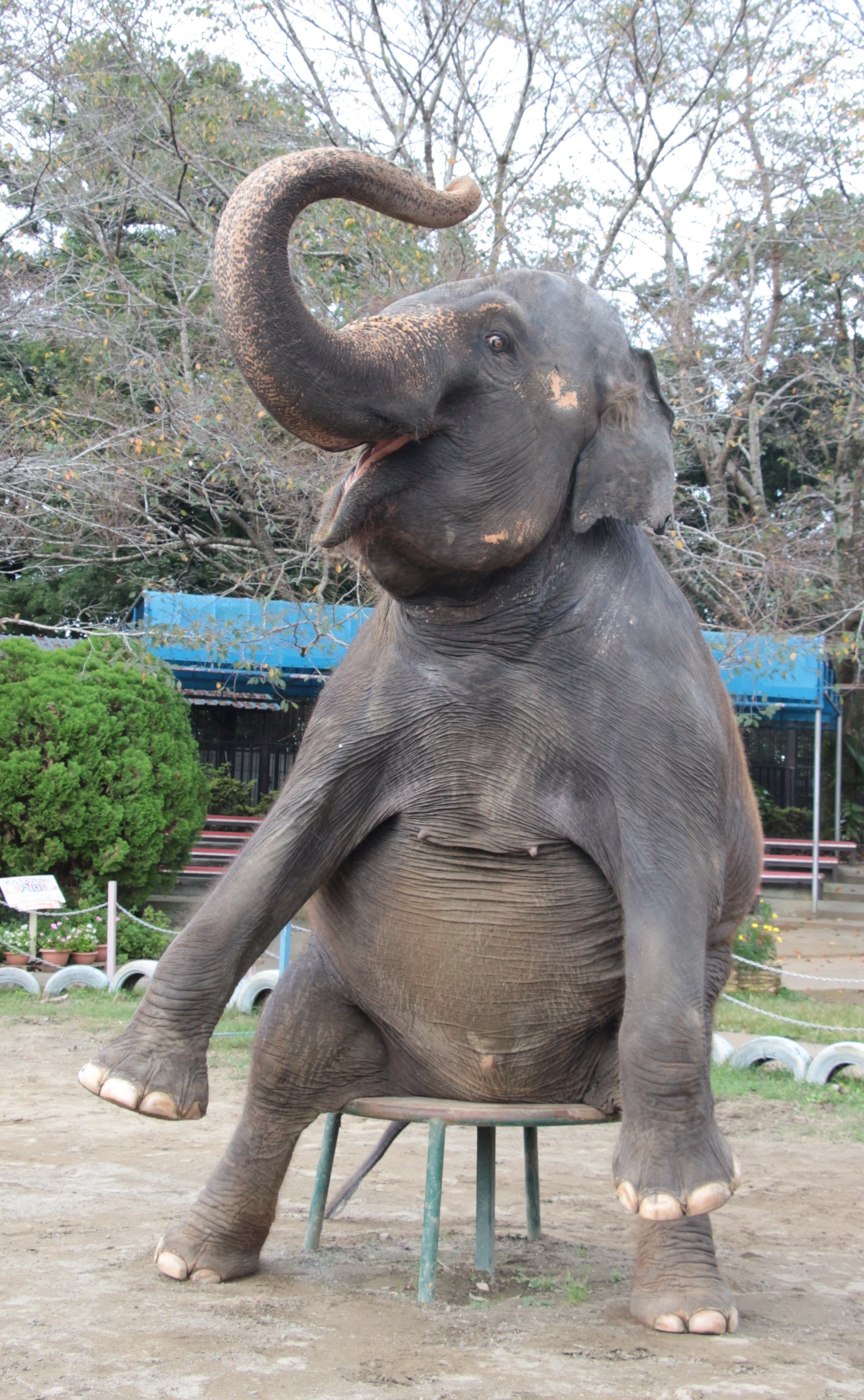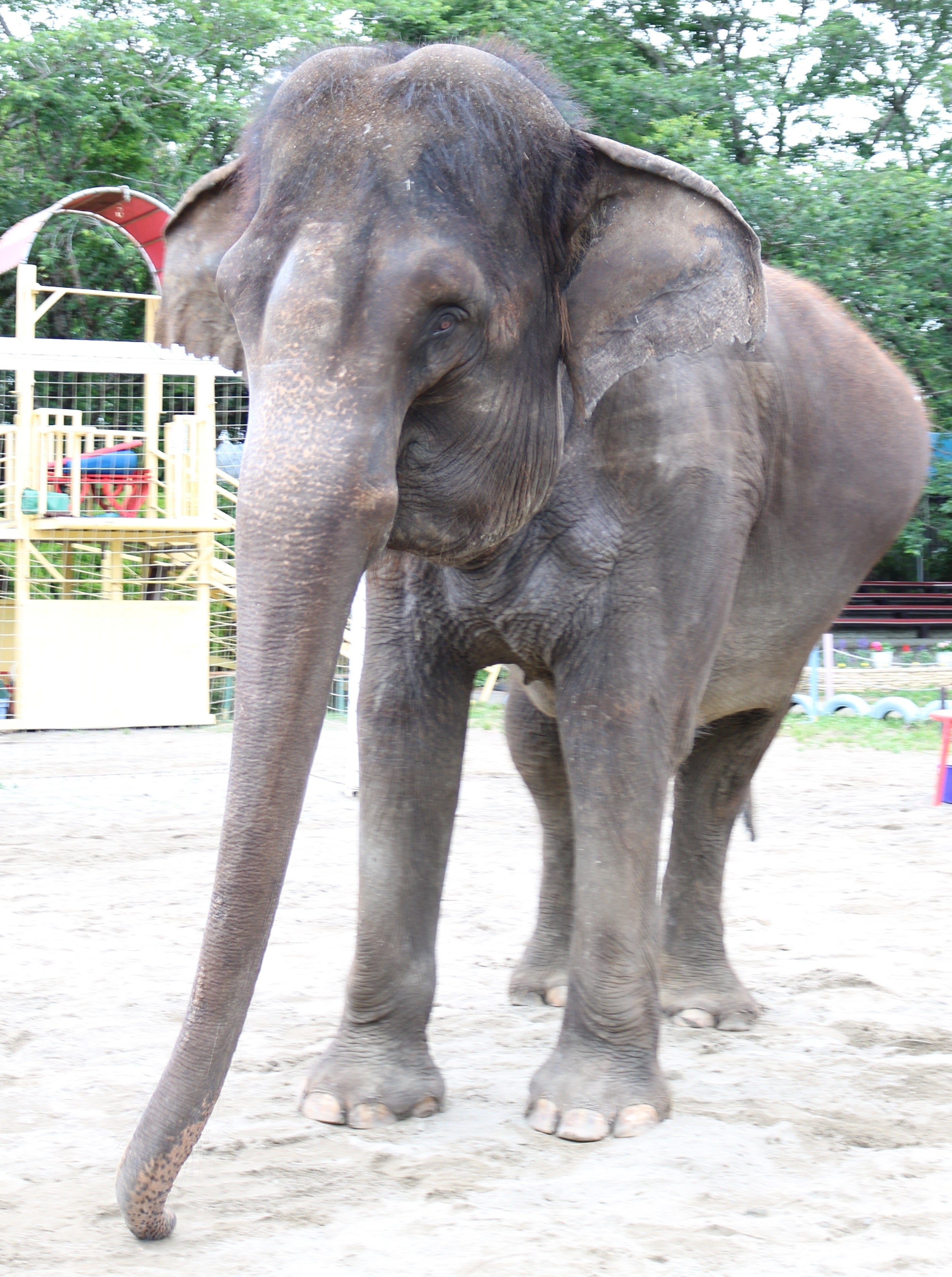 当園で33年暮らしている「ミニスター」は、一番の得意技はサッカーです。ボールを蹴る音は一番力強く迫力満点です。そして、たれ目な可愛いお顔に癒されます。1歳の時タイ王国からきたミニスターは、ミッキーをお母さんの様に慕っています。今は当園生まれの子達みんなの憧れのお姉さんゾウです。