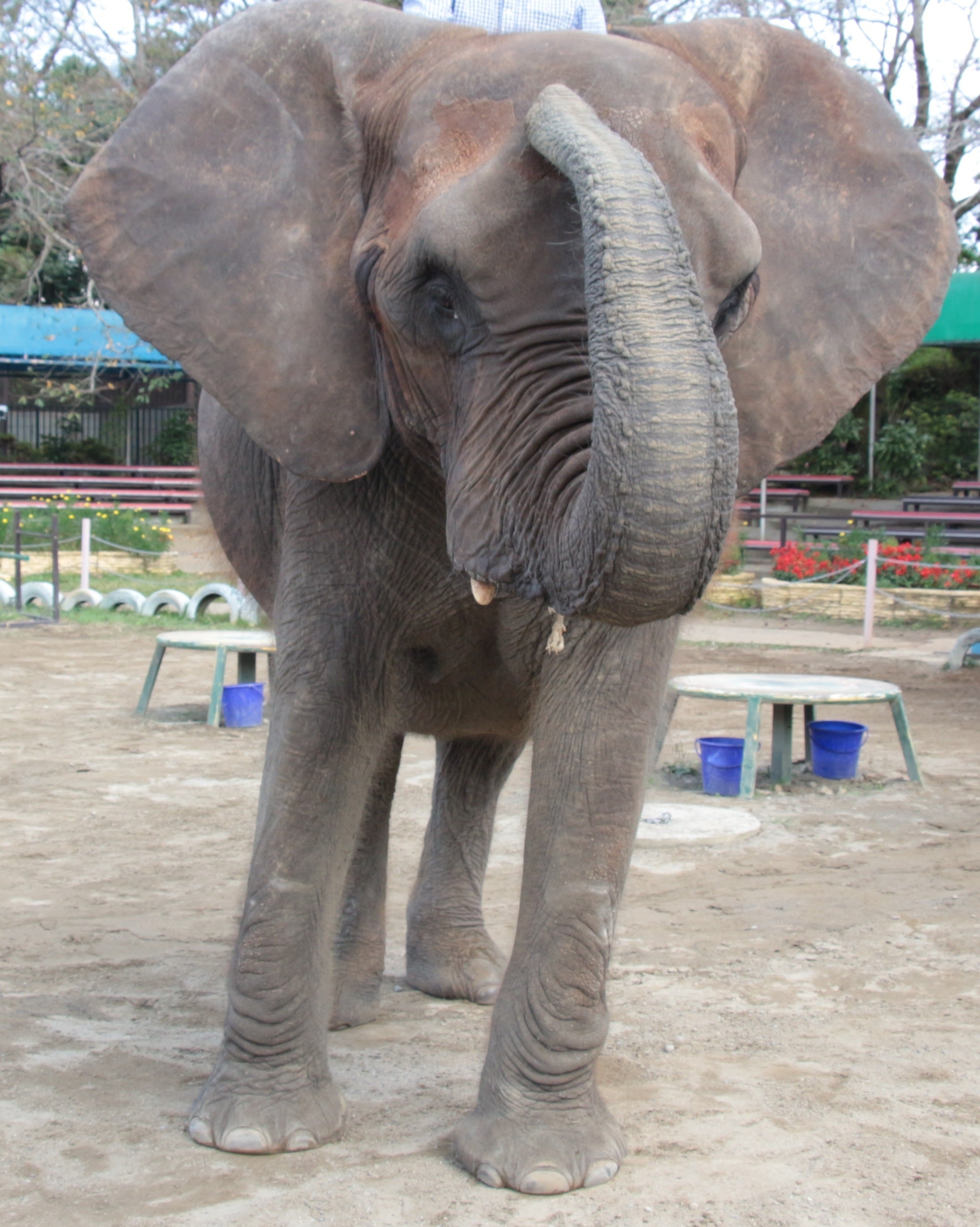 当園で23年暮らしている唯一のアフリカゾウの「サンディ」です。北海道の動物園の閉園を期に来園しました。来園当初は、みんなと一緒にショー広場へ行くこともできませんでしたが少しづつ慣れてきて去年からは、ハーモニカを吹いたりもできるようになりました。アフリカゾウの仲間はいませんが、アジアゾウの仲間として子ゾウ達にも慕われています。
