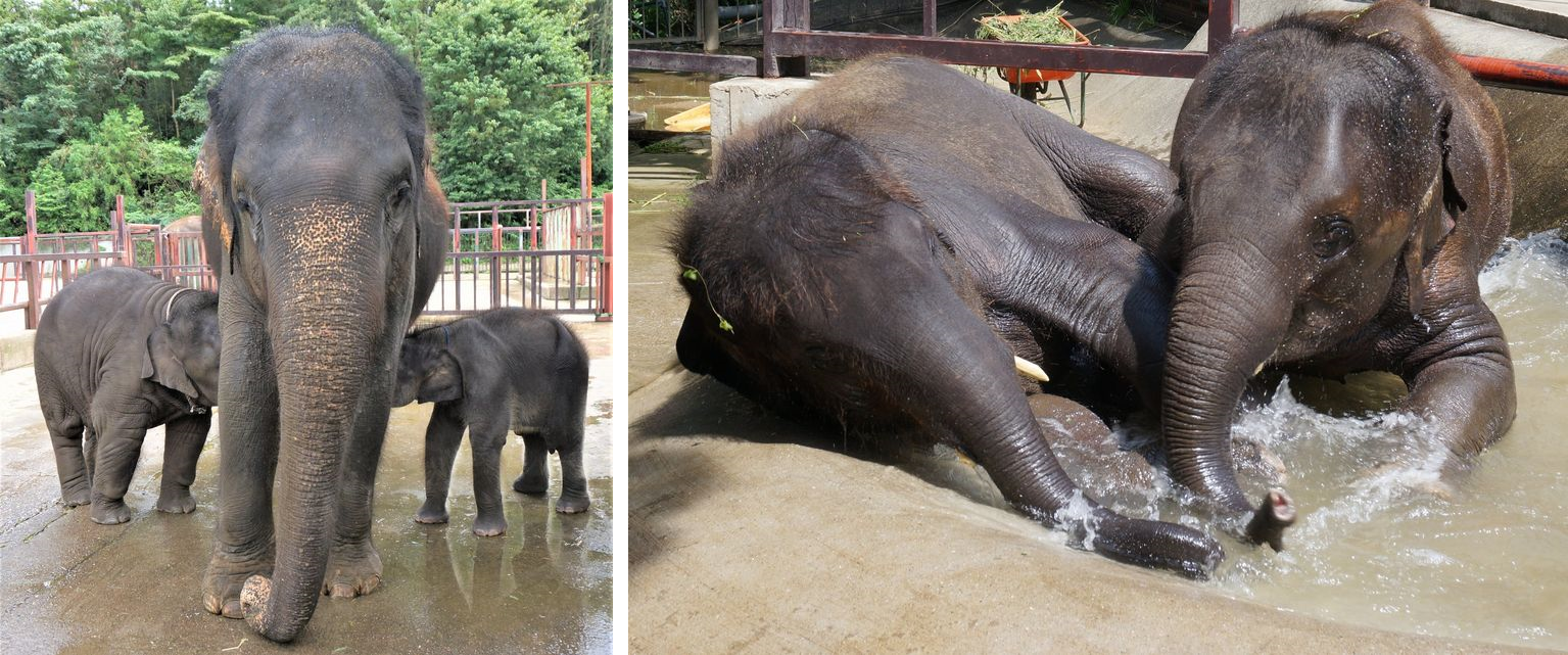 当園ではゾウが多頭飼育され、自然に暮らすゾウの群れと近い状態が再現されているので日本で初めての自然哺育が成功し、また母親ではないメスゾウが乳母となる、世界でも稀なケースでも、ぞうたちは立派に育っています。