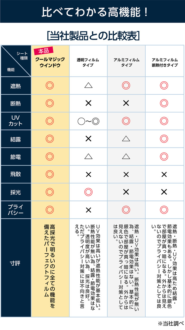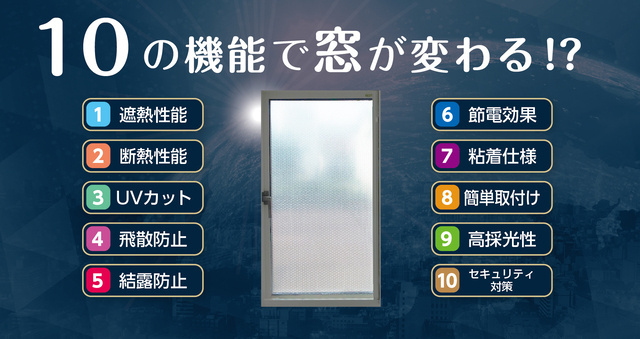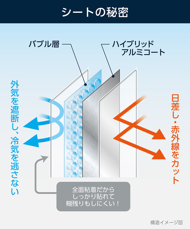 一般的な窓用遮熱フィルムと違い、シートの中間に約4mmの空気層を設けたことで断熱効果&結露防止効果を発揮します。