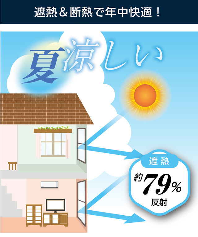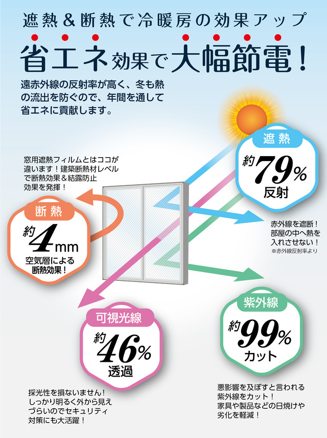 夏は太陽光による赤外線を遮断し、部屋の中への熱の侵入を防ぎ、冬は断熱効果と結露防止効果。夏涼しく、冬暖かいので年間通して節電効果に貢献します。