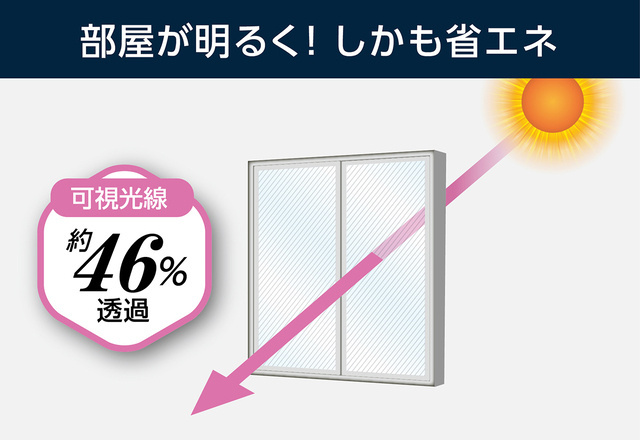 透過率約46%。採光性を保ちつつ、遮熱・紫外線を大幅カット。しかも断熱効果と結露防止効果で快適で明るい環境空間に。