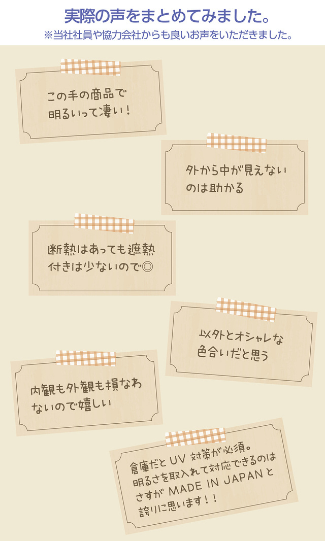 明るいのにハイスペックの遮断熱、そしてUVカットなど、ここまでの商品になった喜びは例えようが有りませんでした。(第三者機関にて、遮熱に関して輻射熱、放射熱などがありますが一般的な赤外線反射率にて、伝導熱は熱伝導率にて検証)