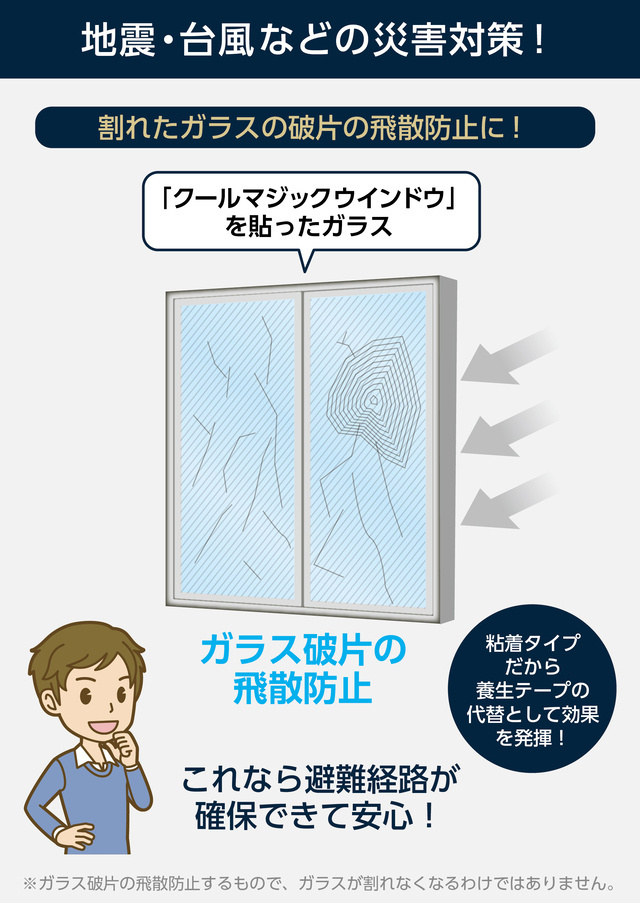 ここ近年多発している台風や強風、地震の衝撃などで割れたガラス破片の飛散を防ぎ、災害時の避難経路を確保します。