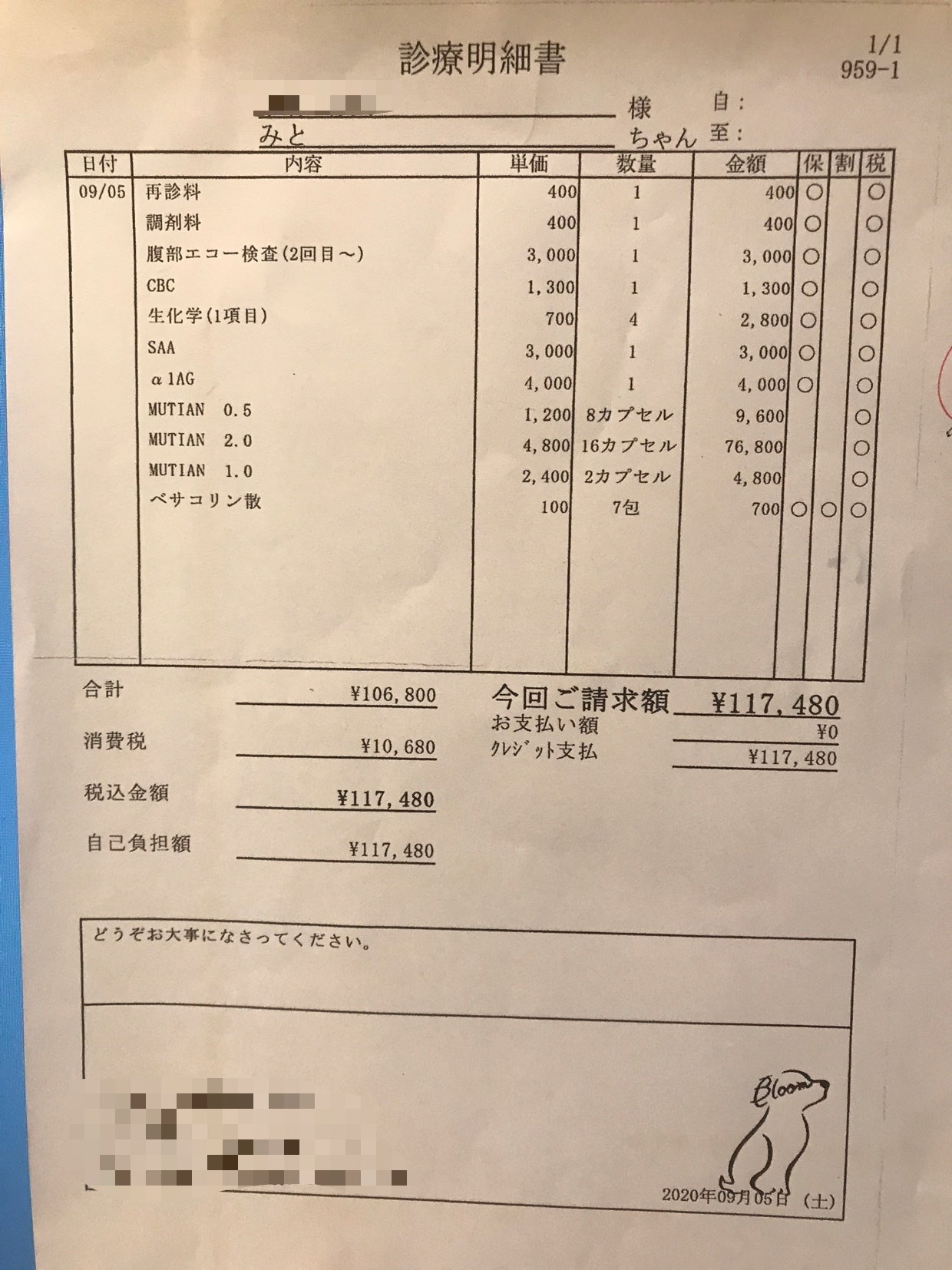 この日は私が予定がありましたので夫が病院へみとちゃんを連れて行き、診察をしていただきました。画像の明細書になります。