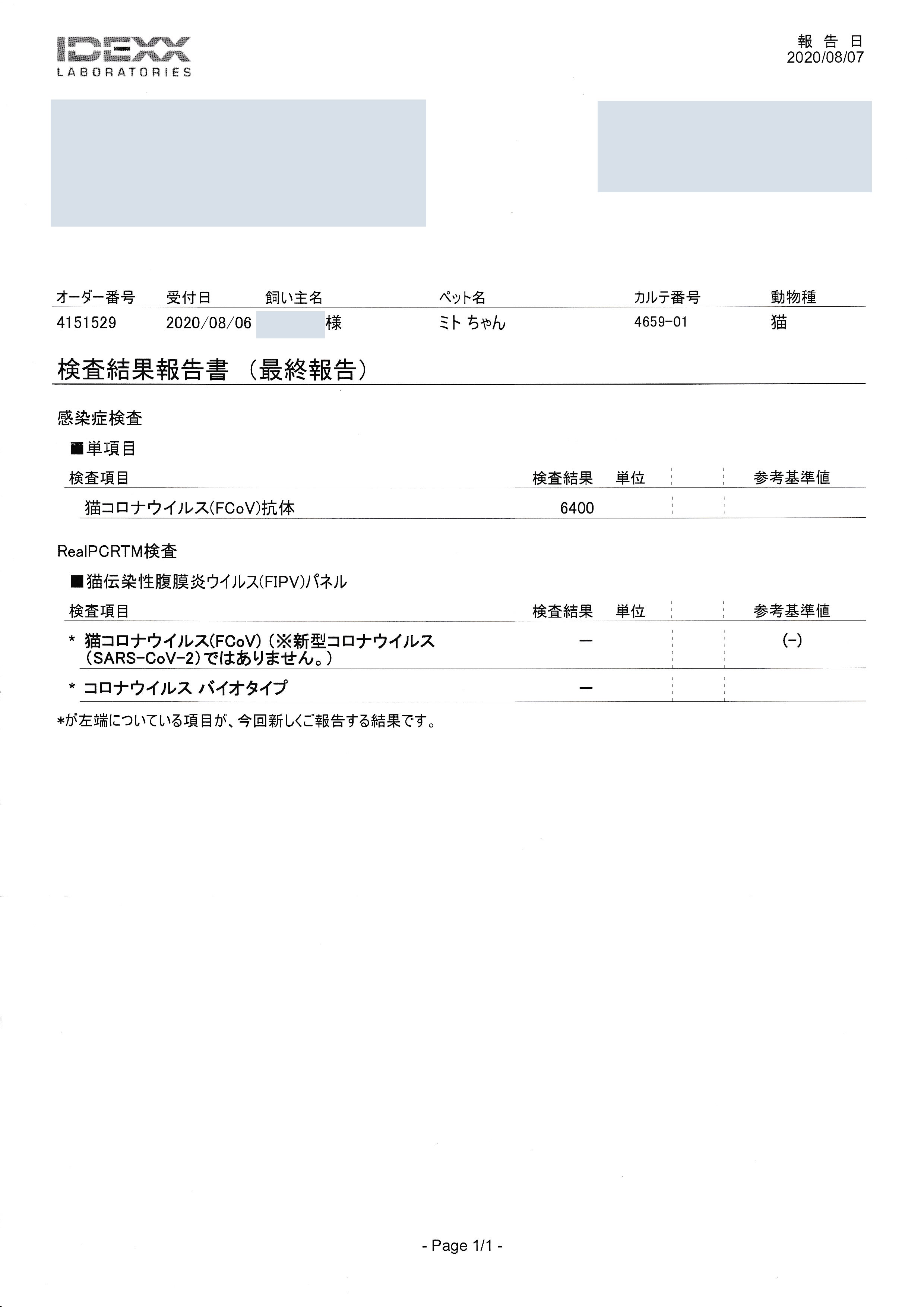 また、先日の血液抗体検査の結果を頂き、猫コロナウイルスの抗体値は非常に高かったものの、その変異形でるFIPの猫コロナウイルスは検出されませんでした。ドライタイプは腹水が溜まらず、それを直接検査することができないため検出されないこともありますが、MUTIANが効けばFIPでまず間違いないだろうとのことでした。