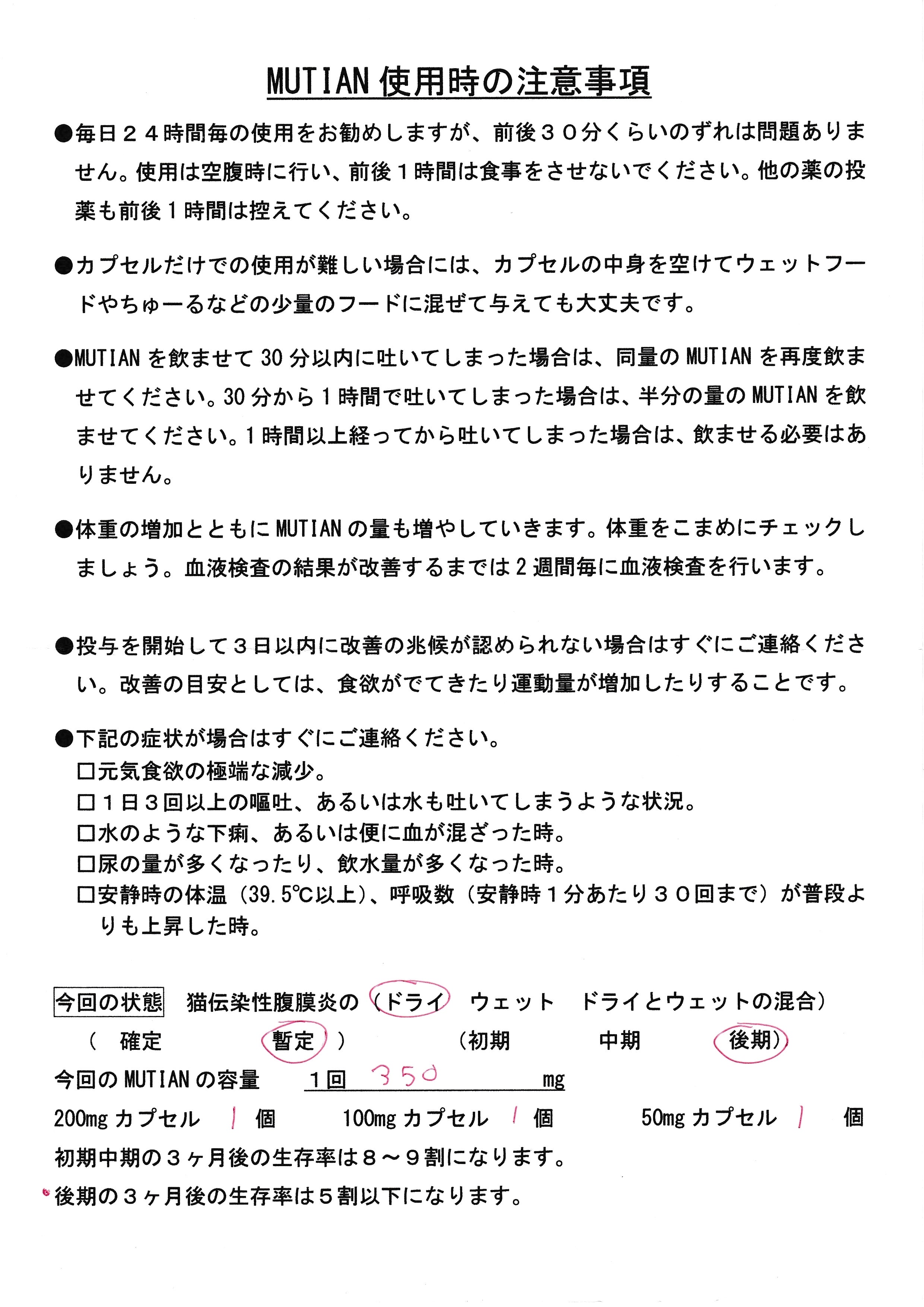 みとちゃんの飼い主として、個人的な自己責任と判断のうえでみとちゃんにとって投与が必要と考えていますが、全てのFIPの猫に「MUTIAN」が有効であるという趣旨ではありません。)