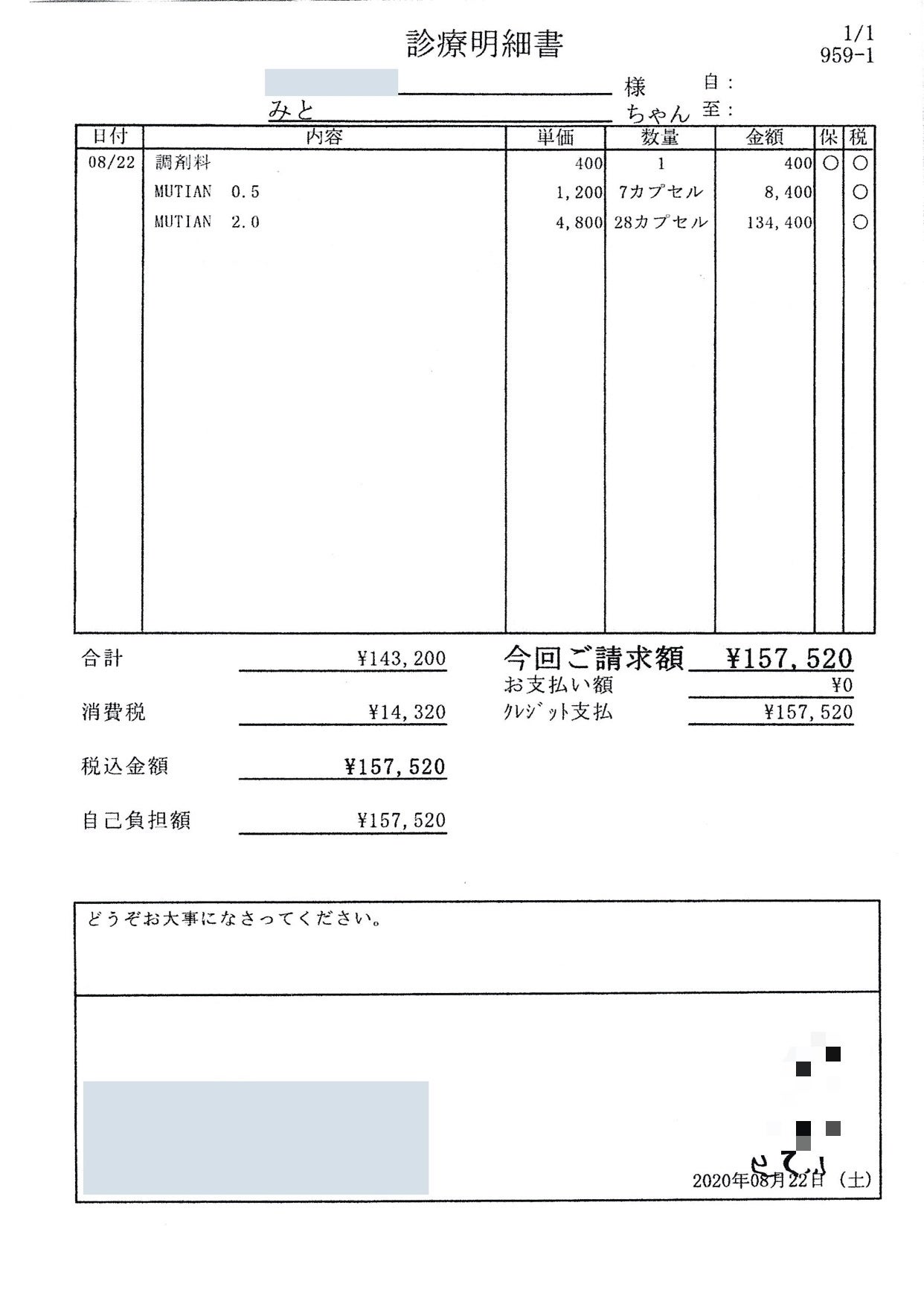 現時点で10月10日までのお薬はもらっていますが、次の診察で投薬終了予定の10月28日まで残り18日分のお薬を一日あたり550mgでもらう予定です。この見込み費用は上記の通りMUTIANだけで236,880円になります。